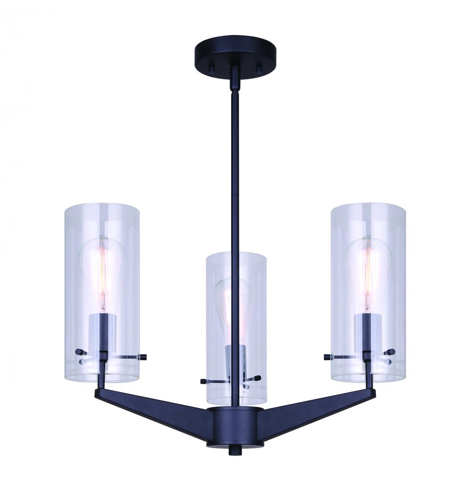 Modern Industrial Style: The JONI Rod Chandelier features a modern industrial design with three lights, a matte black (MBK) finish, and clear glass shades