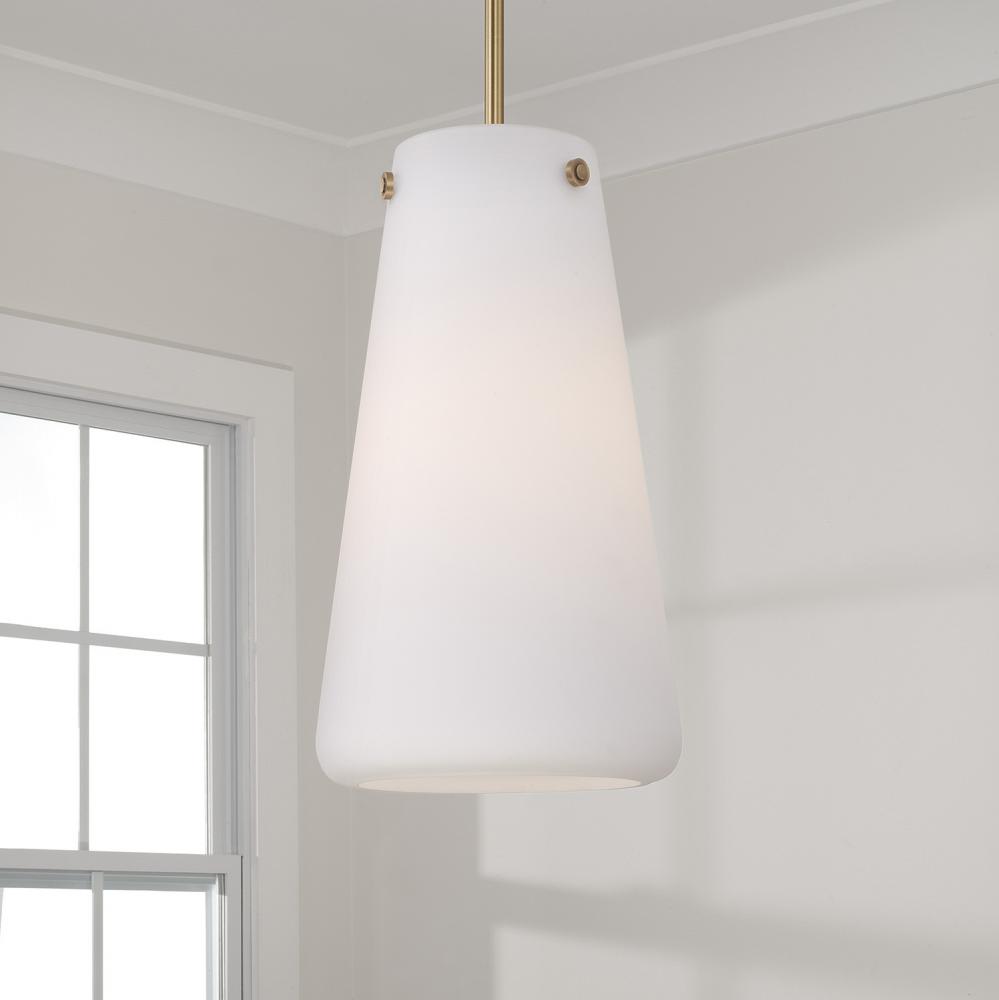 The Averitt Pendant delivers elegant transitional style with grand scale. The exposed rivet details and unique rounded, recessed bottom add high design to the elongated Soft White glass tapered shade, while the Aged Brass finish creates subtle shine and sophistication.