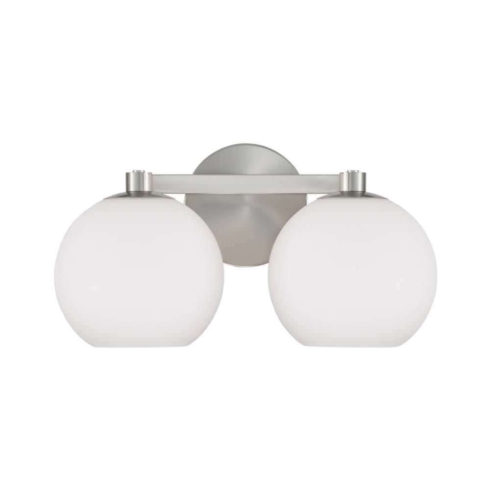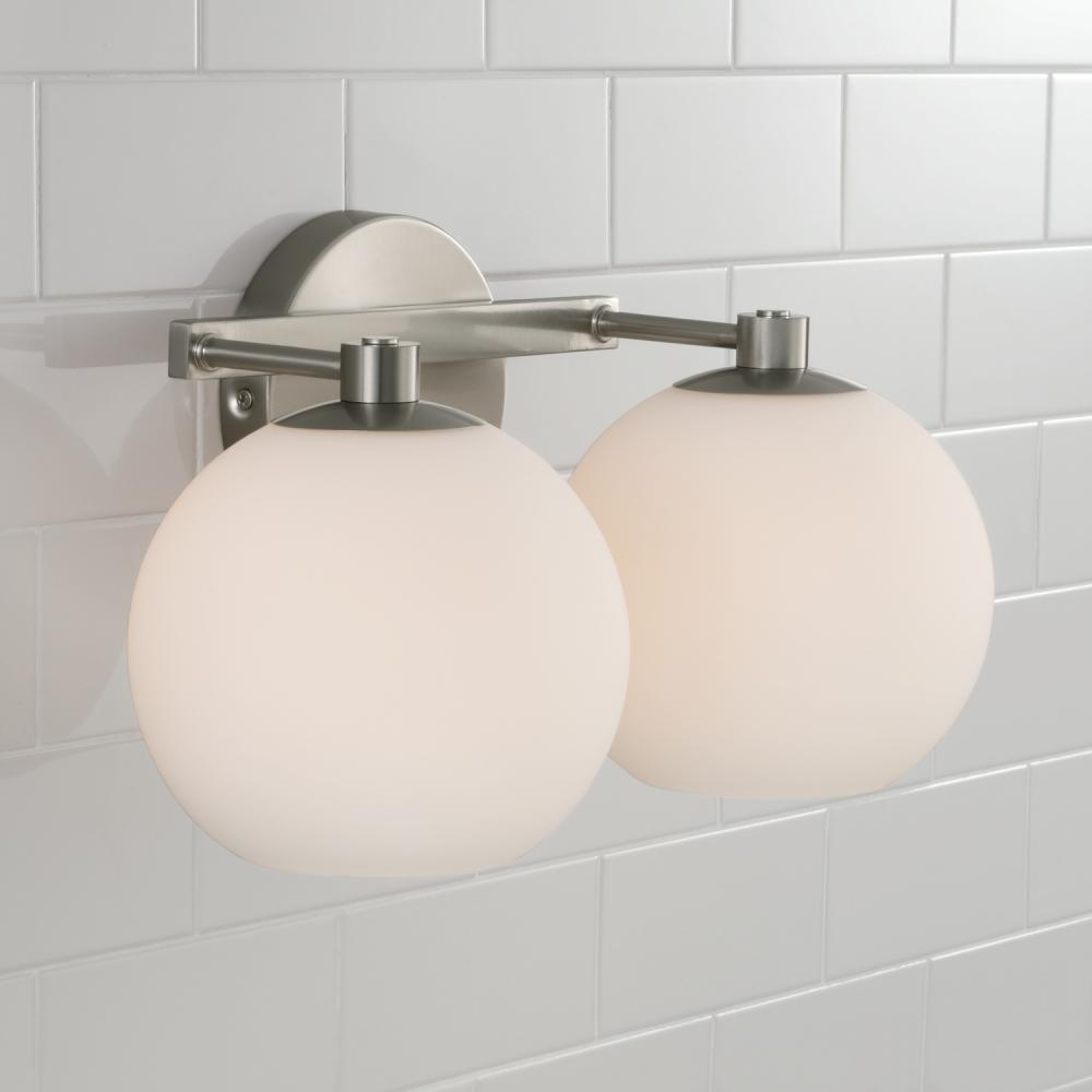 Circular forms meet all-around versatility in the Ansley 2-Light Vanity for HomePlace. The Soft White glass globe shades illuminate sophisticated style, while the Brushed Nickel finish creates a classic aesthetic.