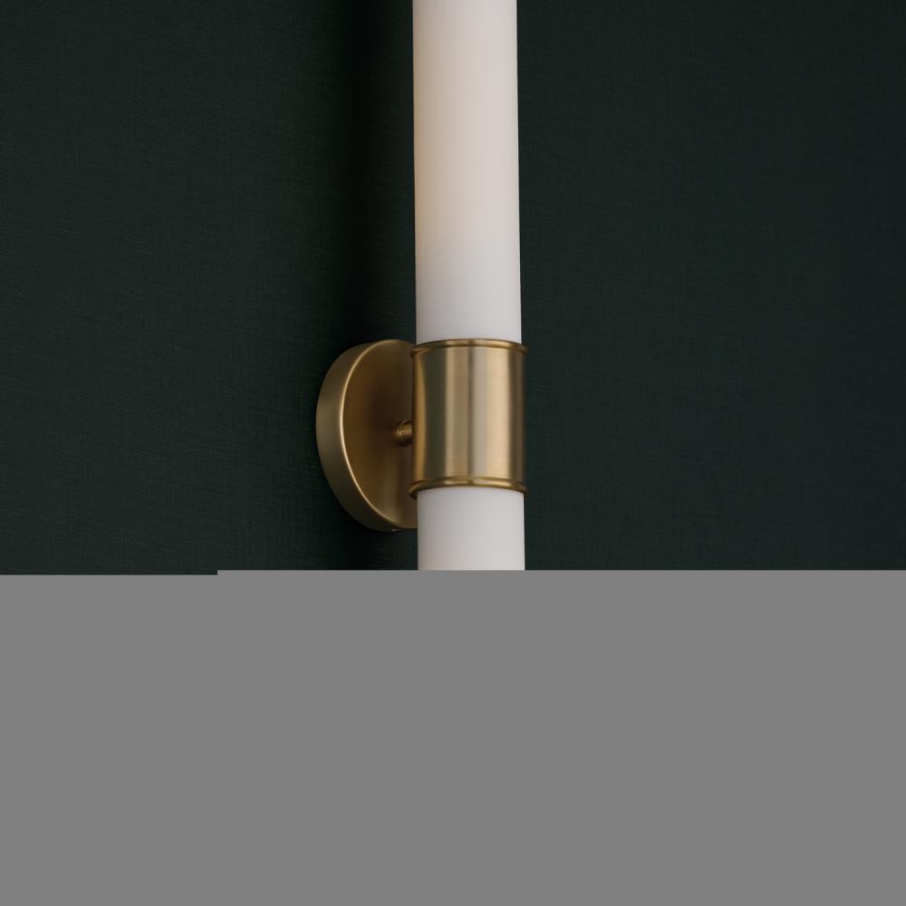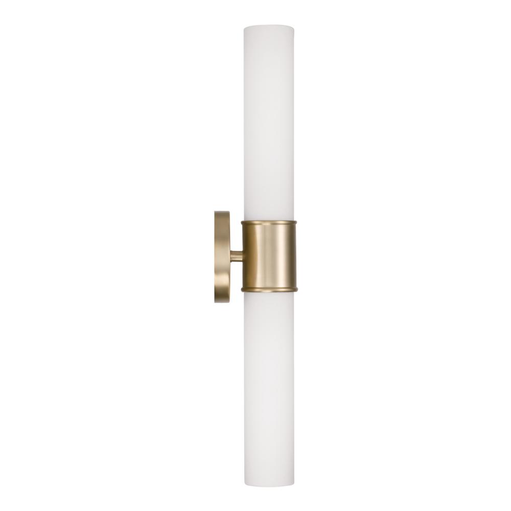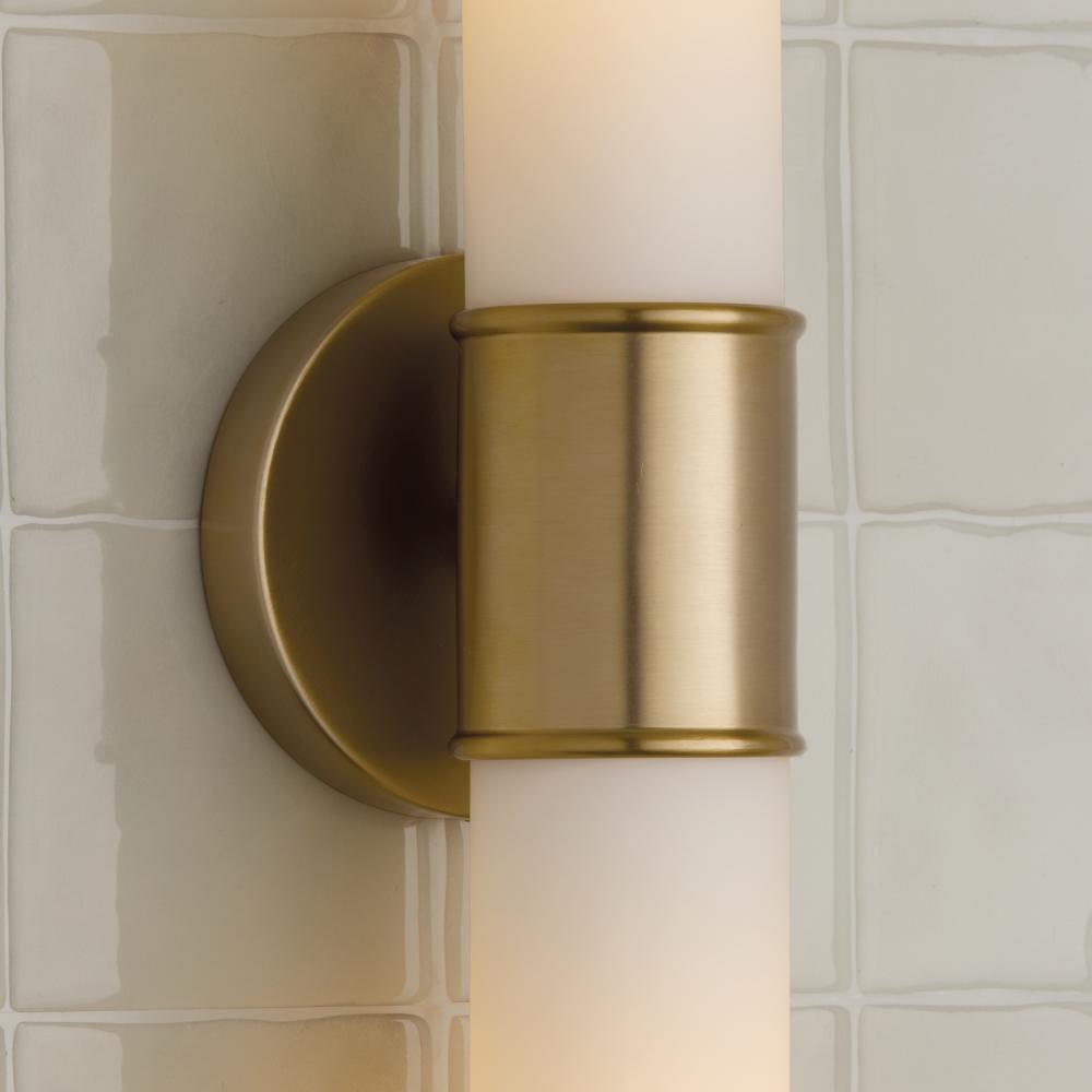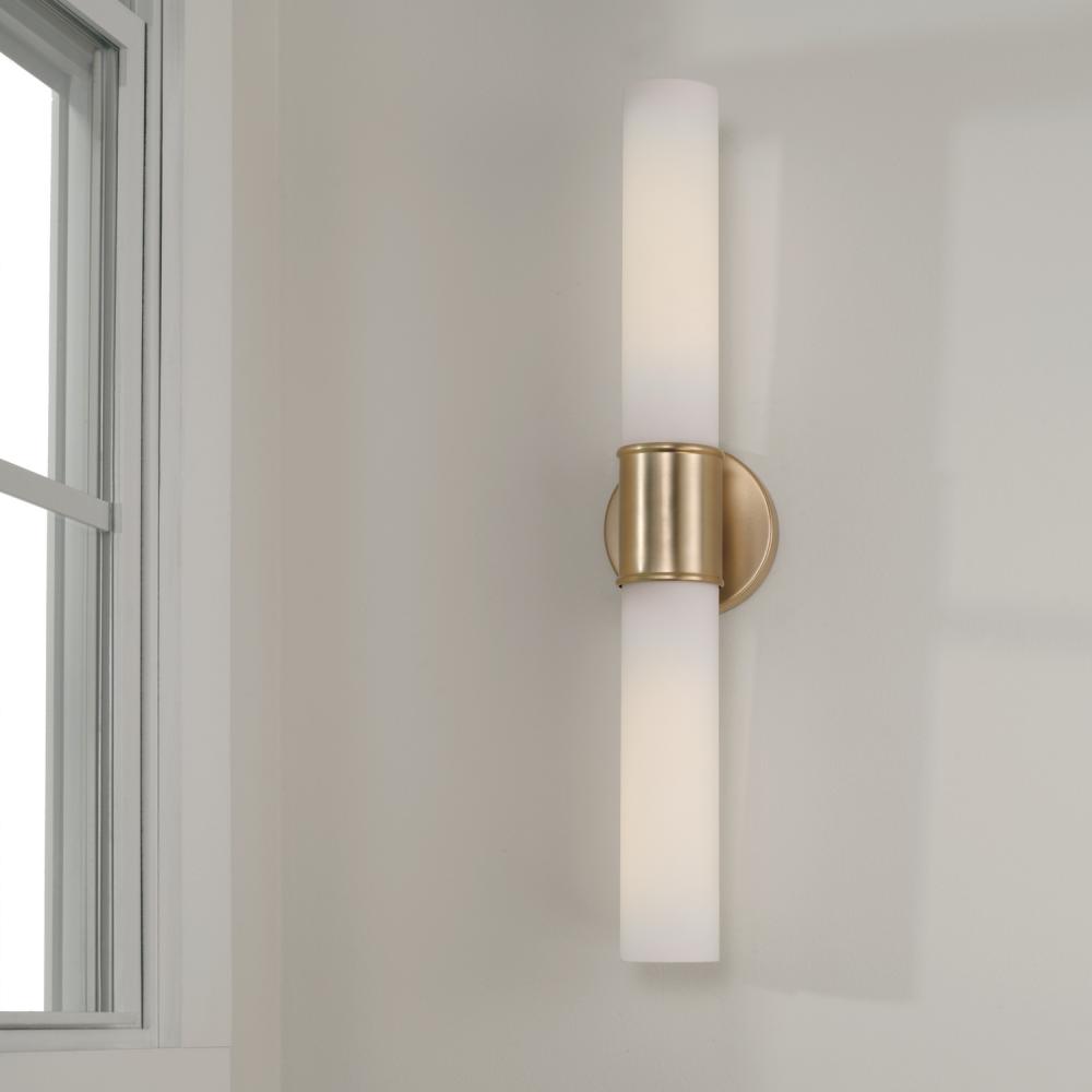 Modern details and an elongated silhouette create the Parson Dual Sconce. The cylindrical Soft White glass shades evoke a sophisticated glow, while the Matte Brass band adds a touch of shine.