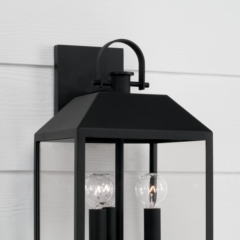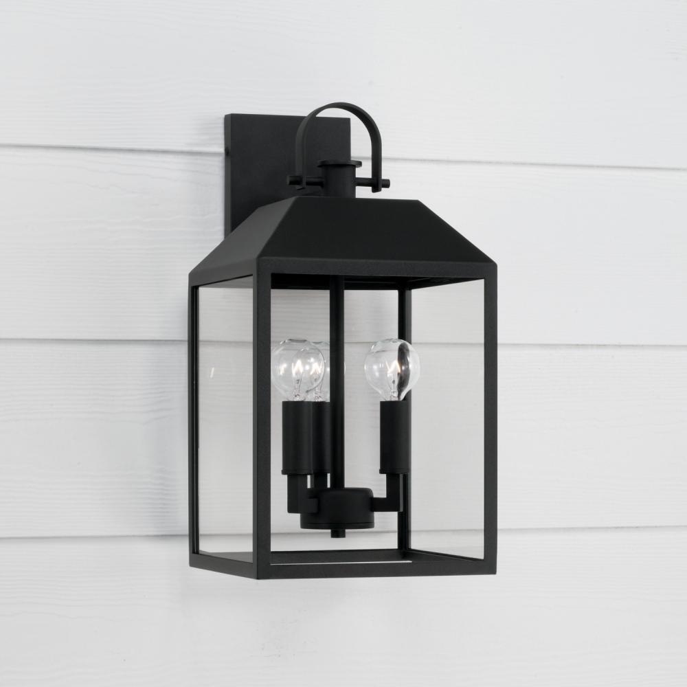 The Black finish punctuates the rectangular form, while the clear glass illuminates a warm welcome.