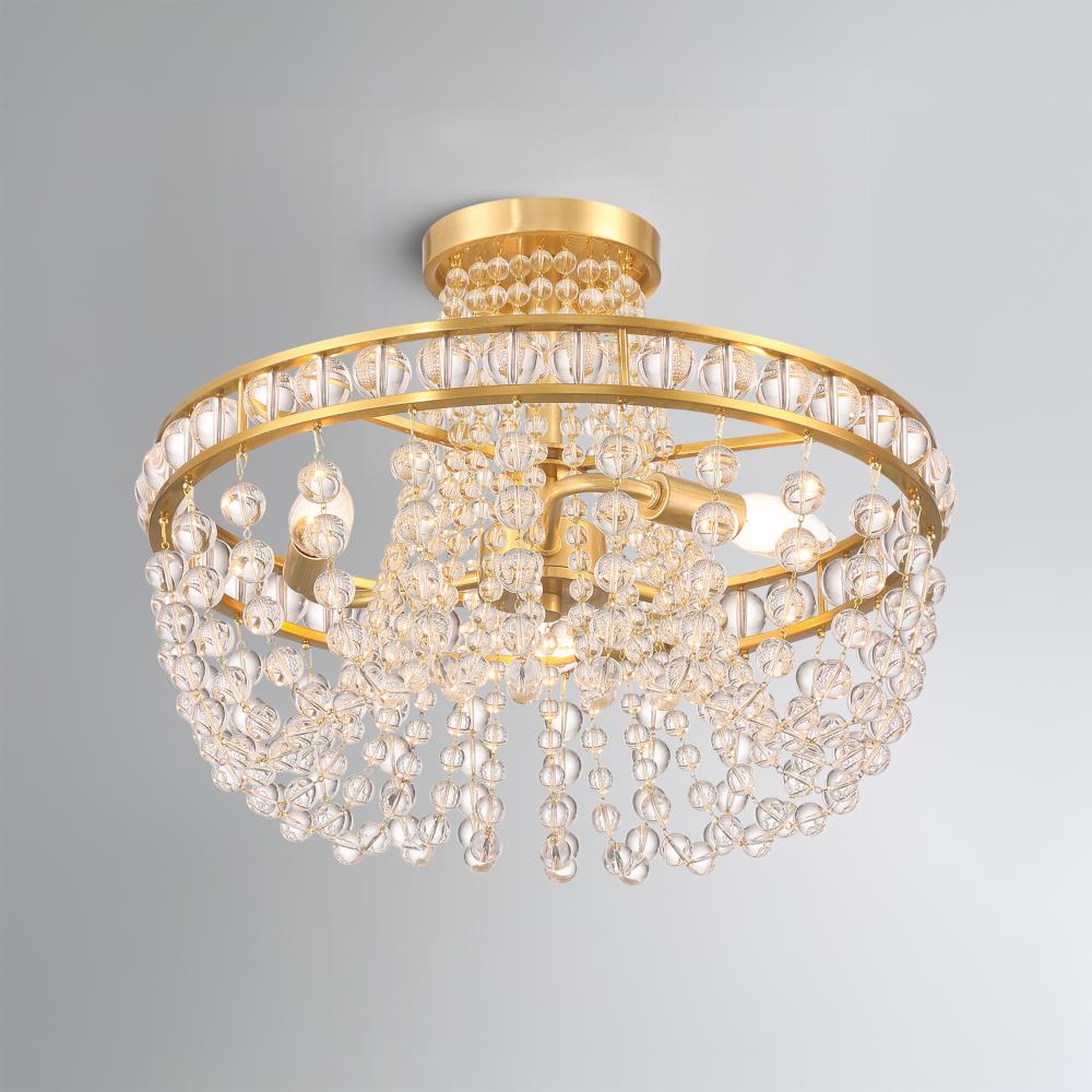 Downward cascading glass balls, connecting the circular gold metal framework.