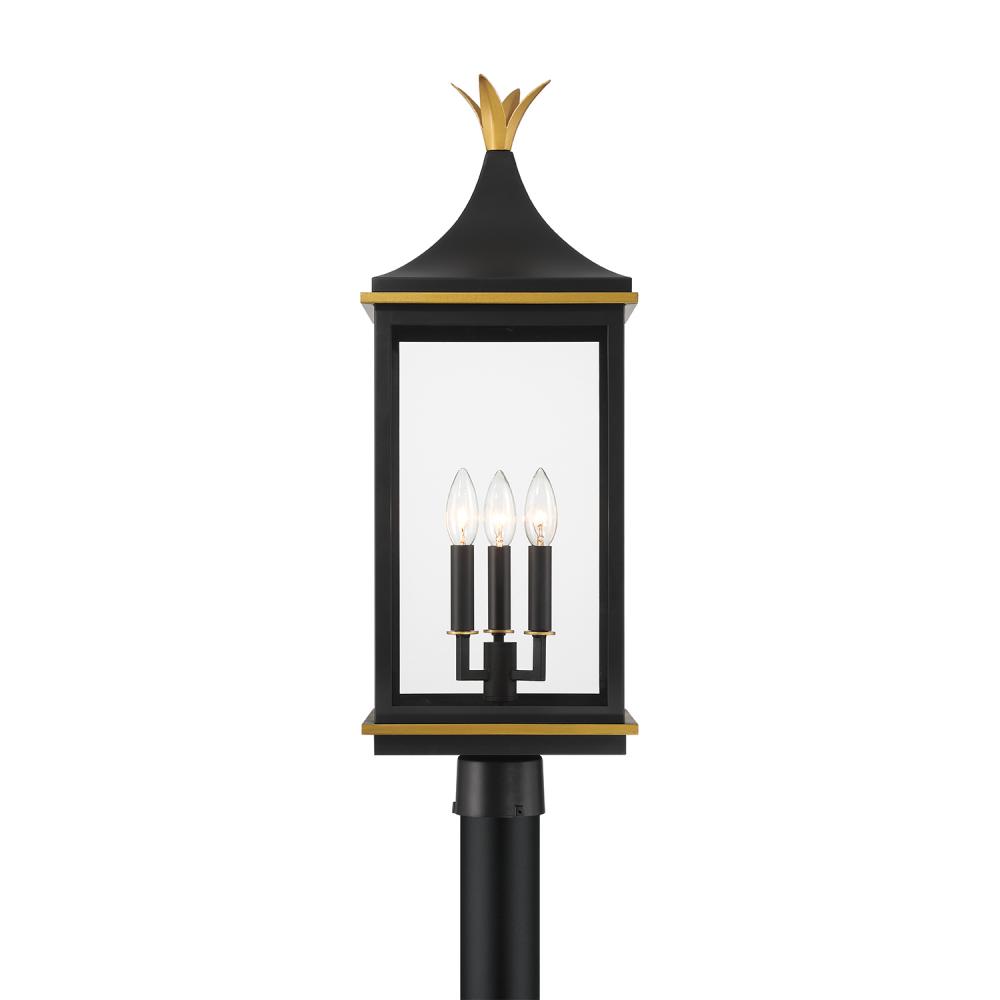 The Simpson Outdoor Collection features a lantern-style design with a two-tone finish. Its elongated rectangular frame, elegant glass panels, and candelabra bulbs create a classic look with a contemporary edge. The collection includes two options for customizing the top: a gold crown cap for a traditional flair or a sleek angled loop for a more contemporary appearance. This versatile design adds a stylish touch to any outdoor setting.