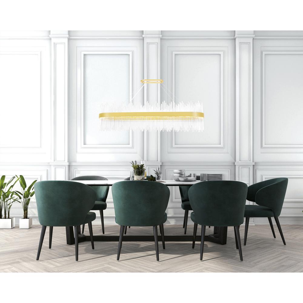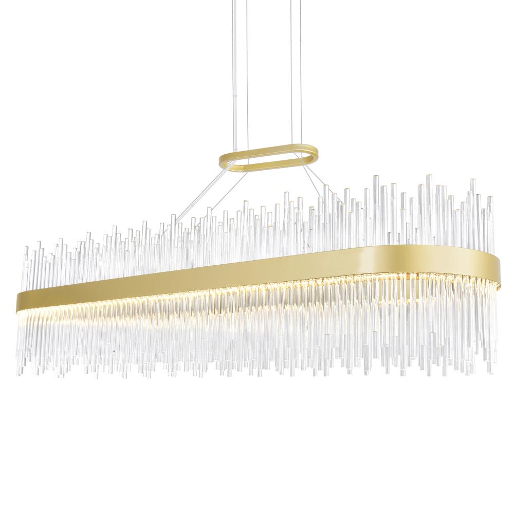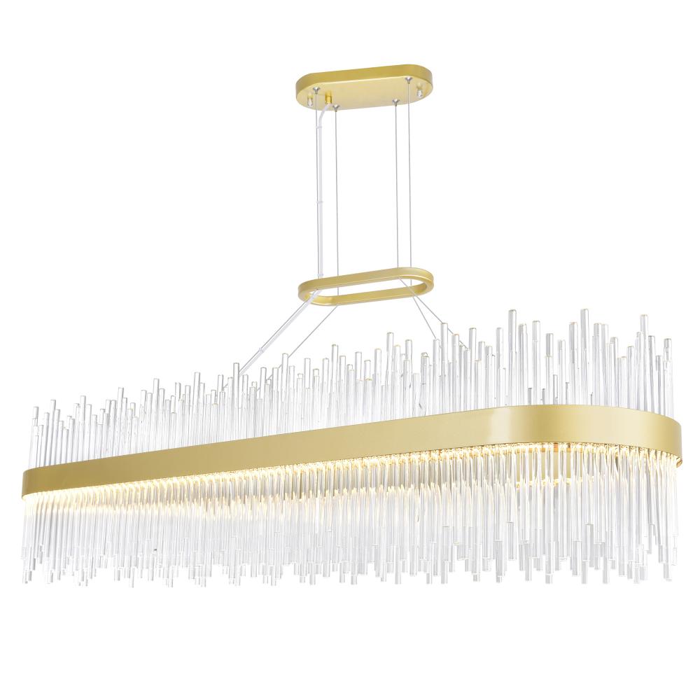 The Genevieve 47 inch LED Chandelier in Medallion Gold will undoubtedly update your decor. This transitional island/pool table light features a golden racetrack frame holding a graceful assembly of clear crystals. Offering you a glistening display of light