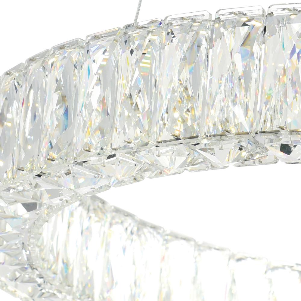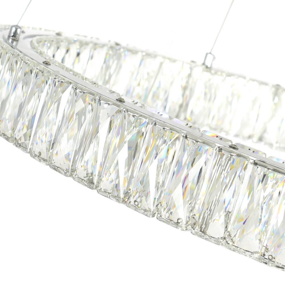 This halo chandelier is not to be missed. The Madeline 1 Ring LED Chandelier features a 3 inch thick round pendant measuring 32 inches in diameter. Its entire side is covered in faceted crystals that diffuse a brilliant but soft glow. Finished with chrome