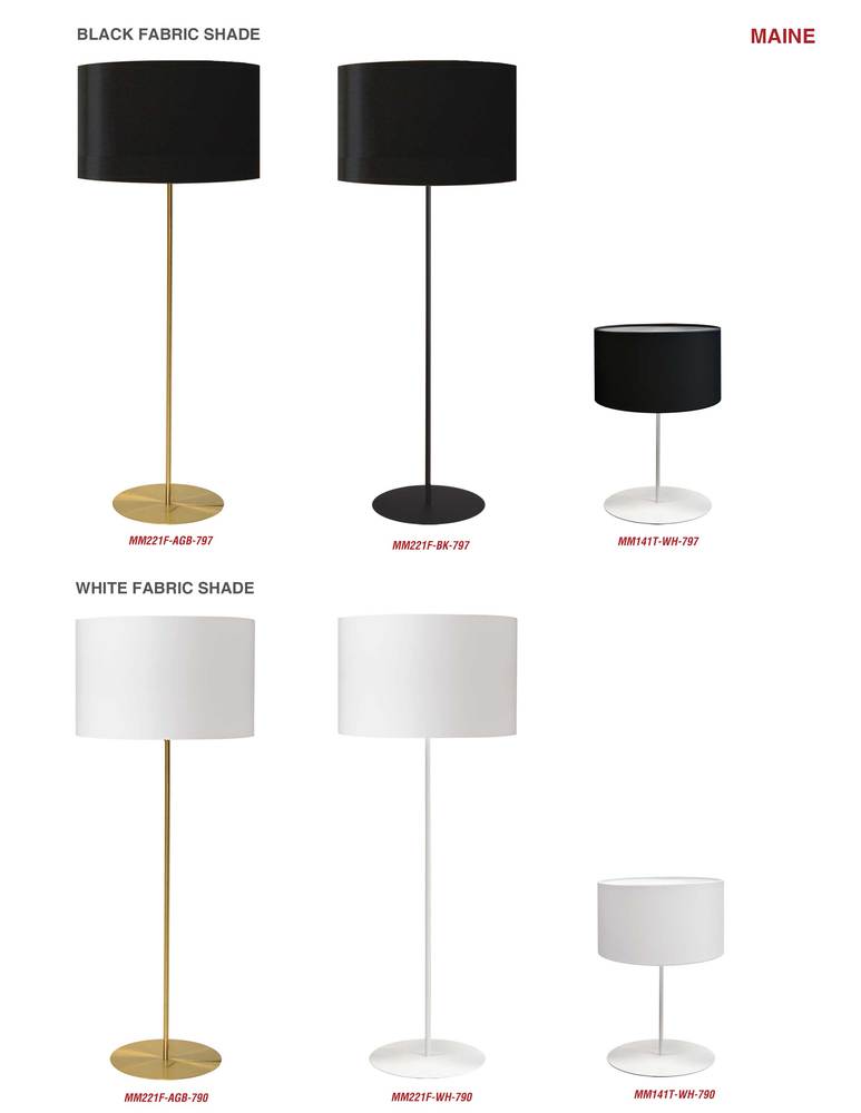 The Maine family of lighting is characterized by a simple silhouette and geometric appeal. Available in floor or table configurations, the look is stylishly simple, and based on contrasting proportions. A round metal base holds a slim rod and frame for a fabric shade. The hardback shade is available in a range of shapes and colors from a simple to tapered drum or cone shade. The look is classically contemporary, with clean lines that will enhance the furnishings in your bedroom, living room or office space.