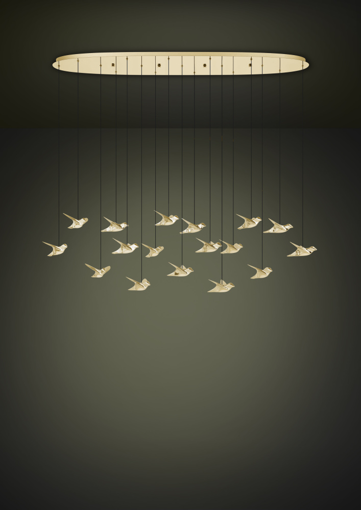 17 LT LED Linear Pendant w/ Brass Finish & Gold Bird Shaped Shades w/ Acrylic Diffusers