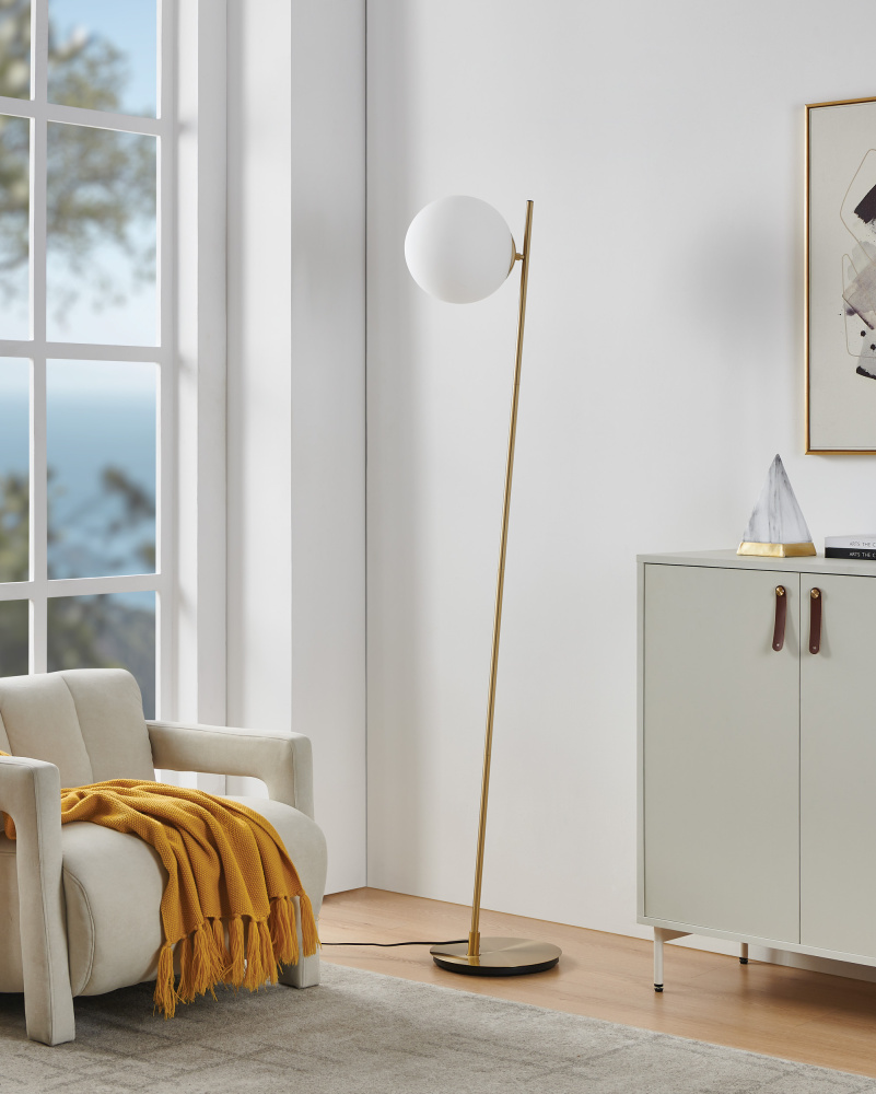 1 LT Floor Lamp w/ Brushed Gold Finish & White Glass Sphere Shade