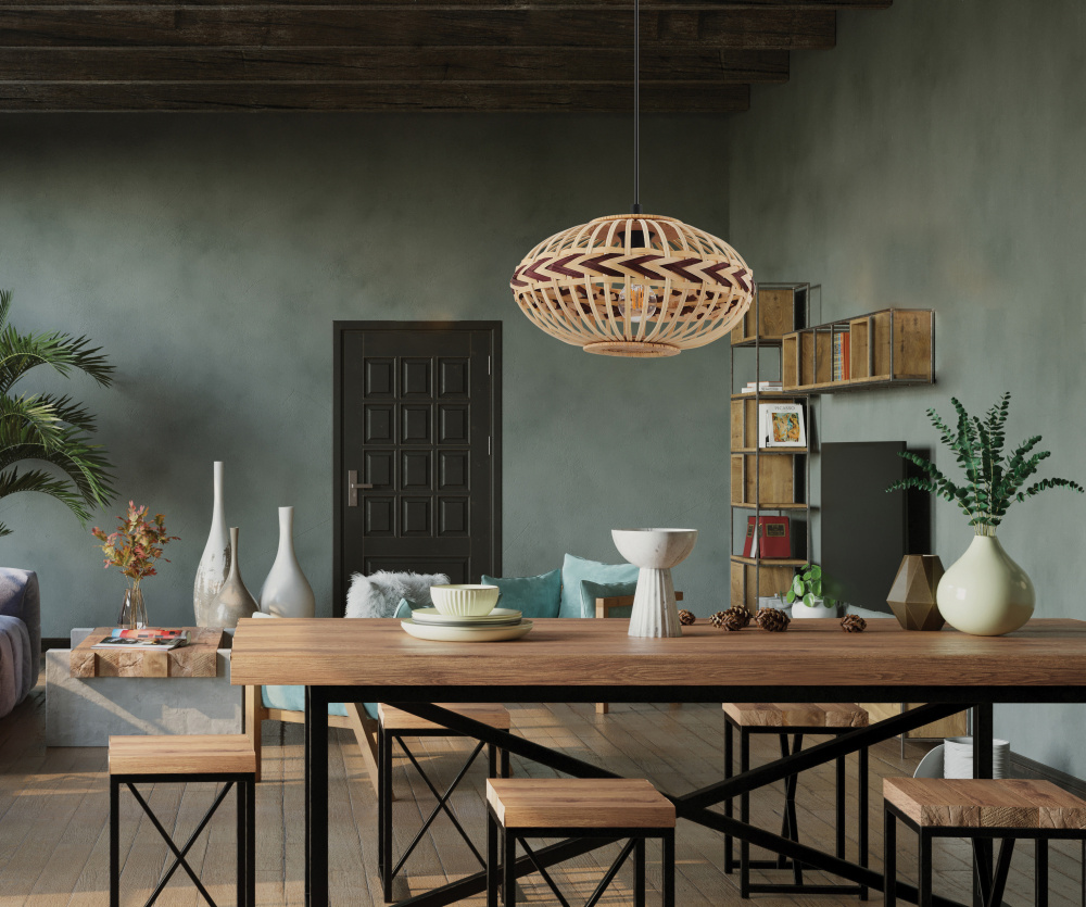 1 LT Pendant w/ Black Finish & Natural Wood Shade w/ Burgandy Accents