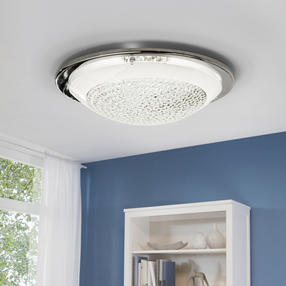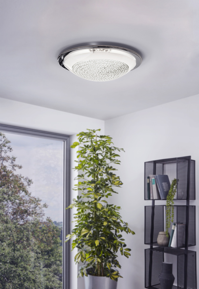 LED Ceiling Light w/ Chrome Finish & White & Clear Glass Shade w/ Clear Glass Stones