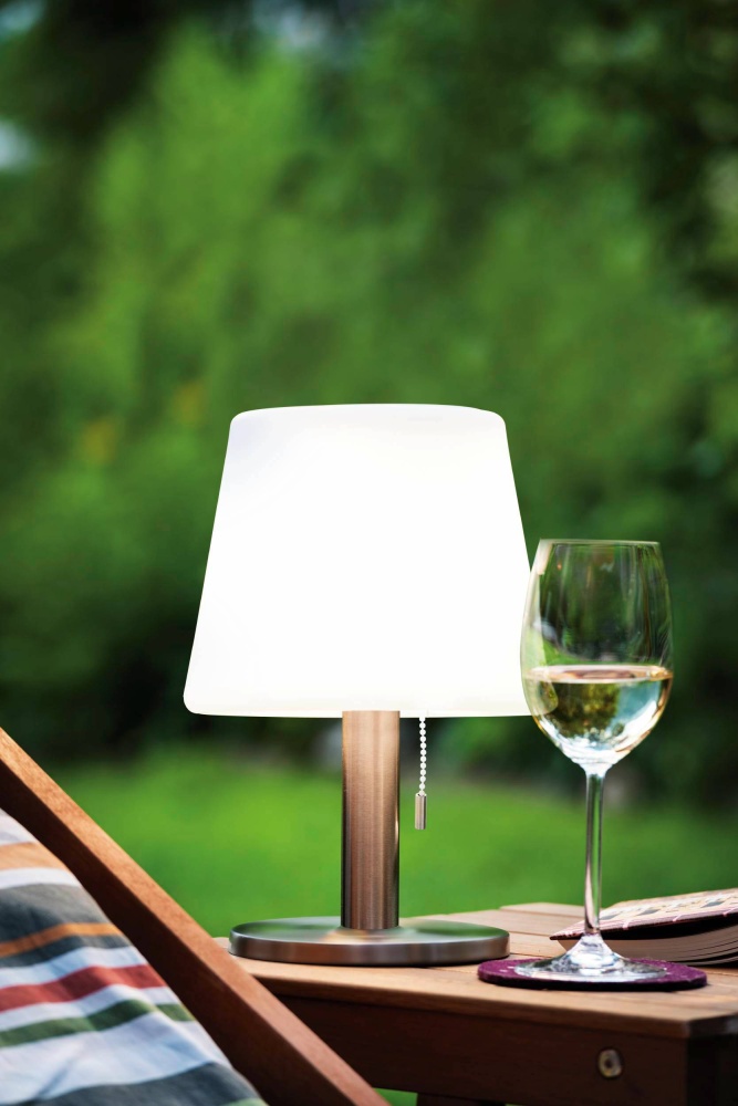 Enhance your outdoor space with the Solar LED table lamp. Featuring a silver finish with a white plastic shade. This Solar LED table lamp creates a fun and exciting atmosphere wherever it is placed. Being completely solar allows for function anywhere in your outdoor space without needing electrical power. 1-AA Battery not included