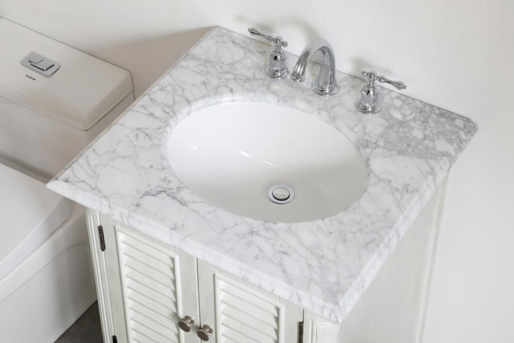A small space doesn't mean you have to settle for less. The Rhodes collection compact vanity in an antique white finish will add lovely sophistication and complement any small bathroom or powder room, while utilizing its charm and function to provide you with ample storage spaces. Brushed nickel knobs gently adorn the shuttered cabinet doors and drawer at the base, allowing for you to store away your bathroom essentials. The Carrara white marble countertop, porcelain undermount sink, dignified subtle engravings on the side edges, and rounded legs all come together to create contemporary beauty. Work with your space, and design a beautiful room, no matter the size.