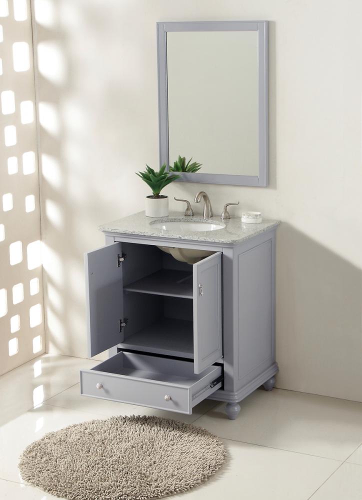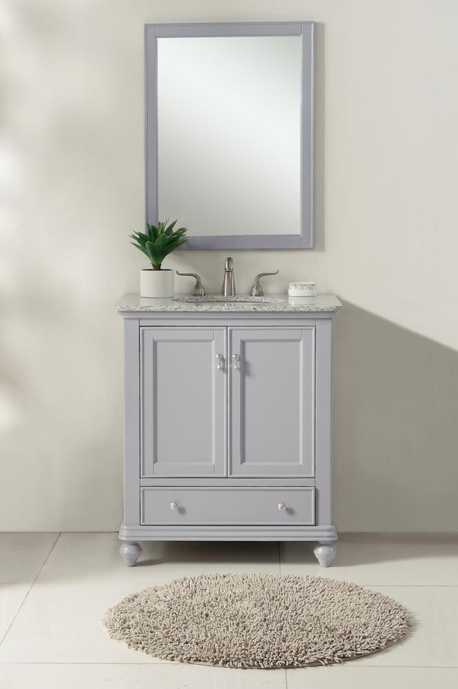 A sleekly styled 2 door, 1 drawer granite-topped bathroom vanity like this can only bring a smile of appreciation for its simple beauty and clean lines. With an authentic Kashmir white granite counter top, oval white porcelain sink, hand painted soft grey cabinet, 2 soft-close doors and a drawer, brushed steel hardware, carved bun feet, this elegant, transitional vanity balances form and function. Measurements: W30”xD21”xH35”
