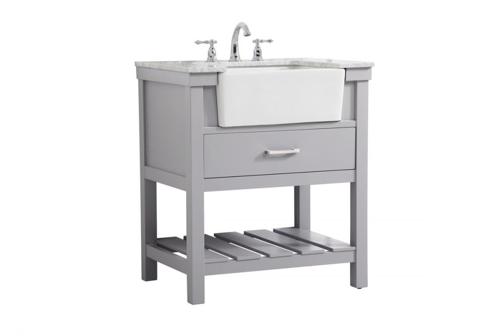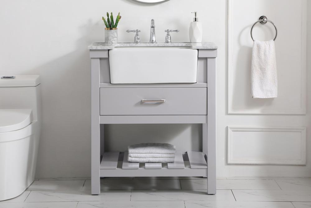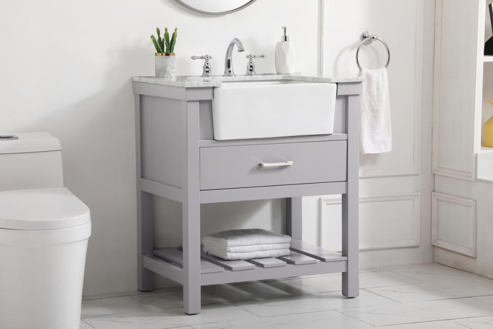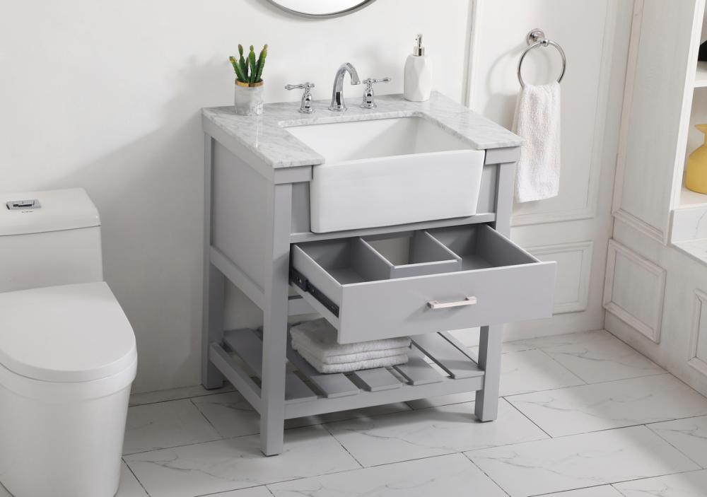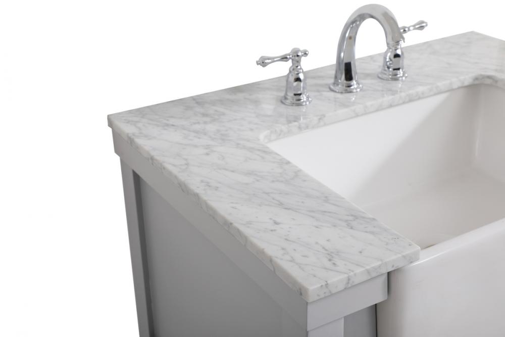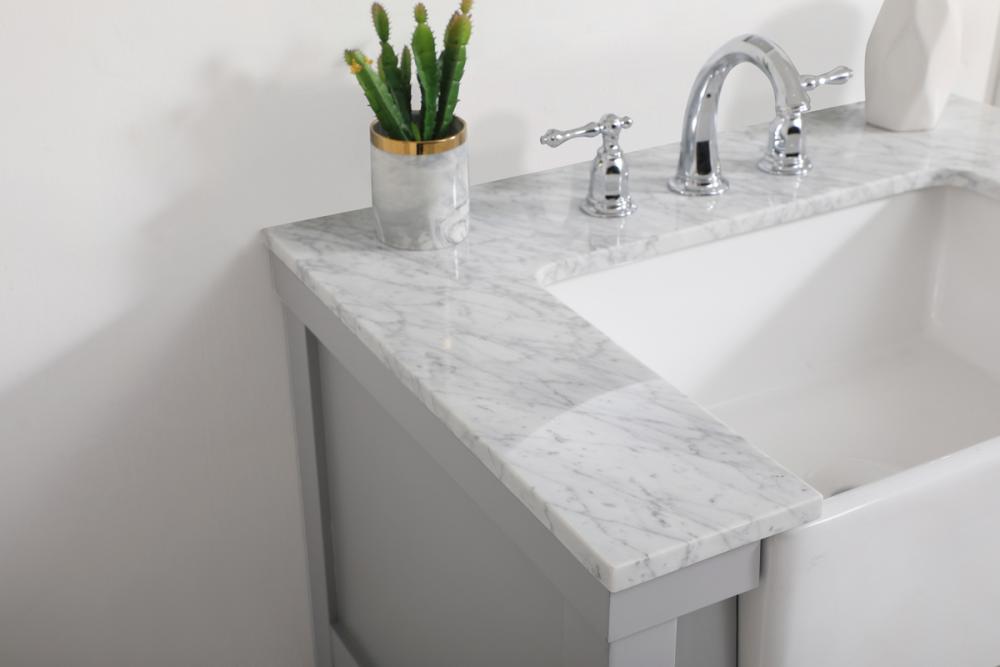 Make the most of your space with this farmhouse style bathroom vanity. Complements well with its beautiful finish, carrara white marble countertop, and the contemporary slender handle bar that sits on the functional drawers with soft closing mechanism, allowing you to store an assortment of bathroom essentials. The lower shelf makes it the perfect space to hold new towels for your guests. This stylish vanity ensures both form and function in your bathroom for you and your guests.