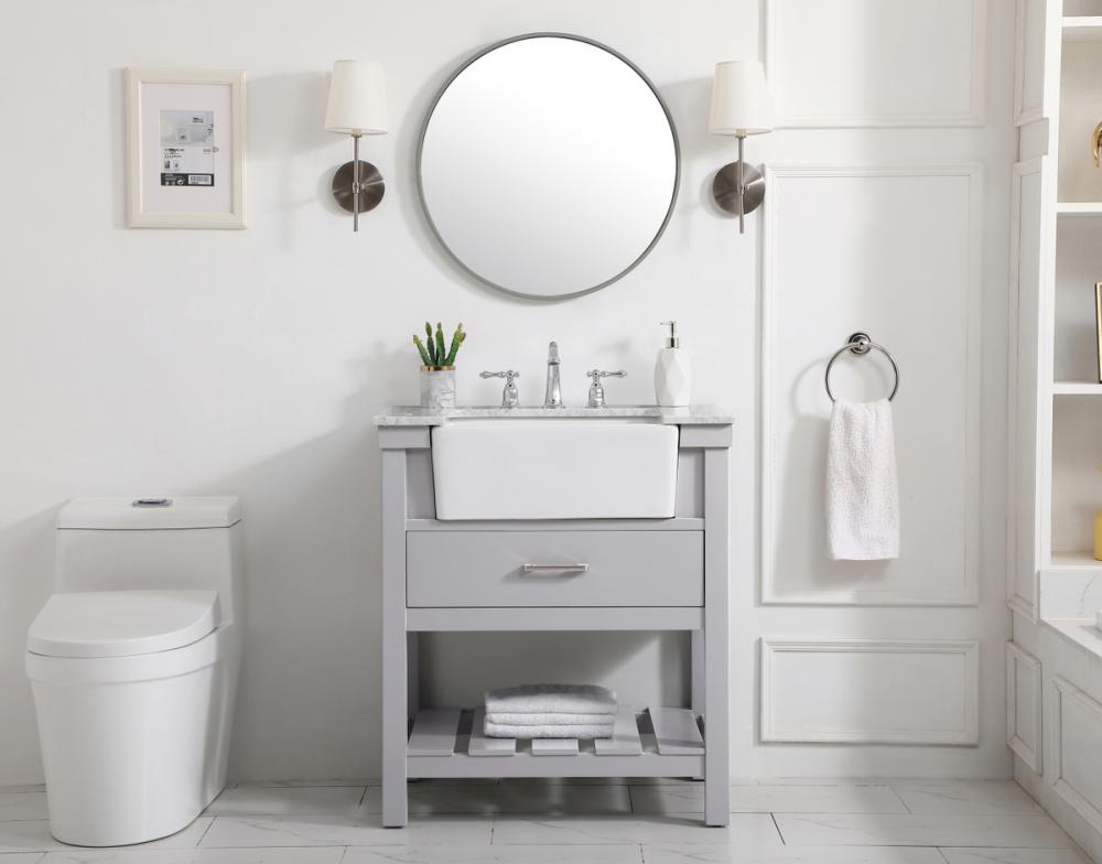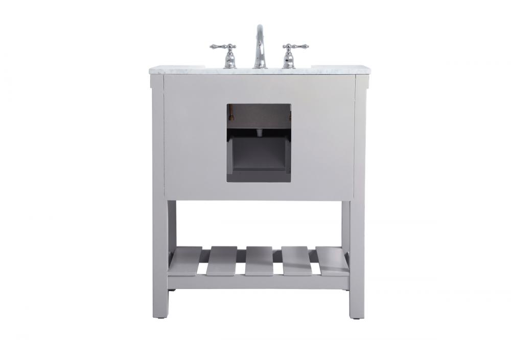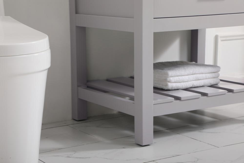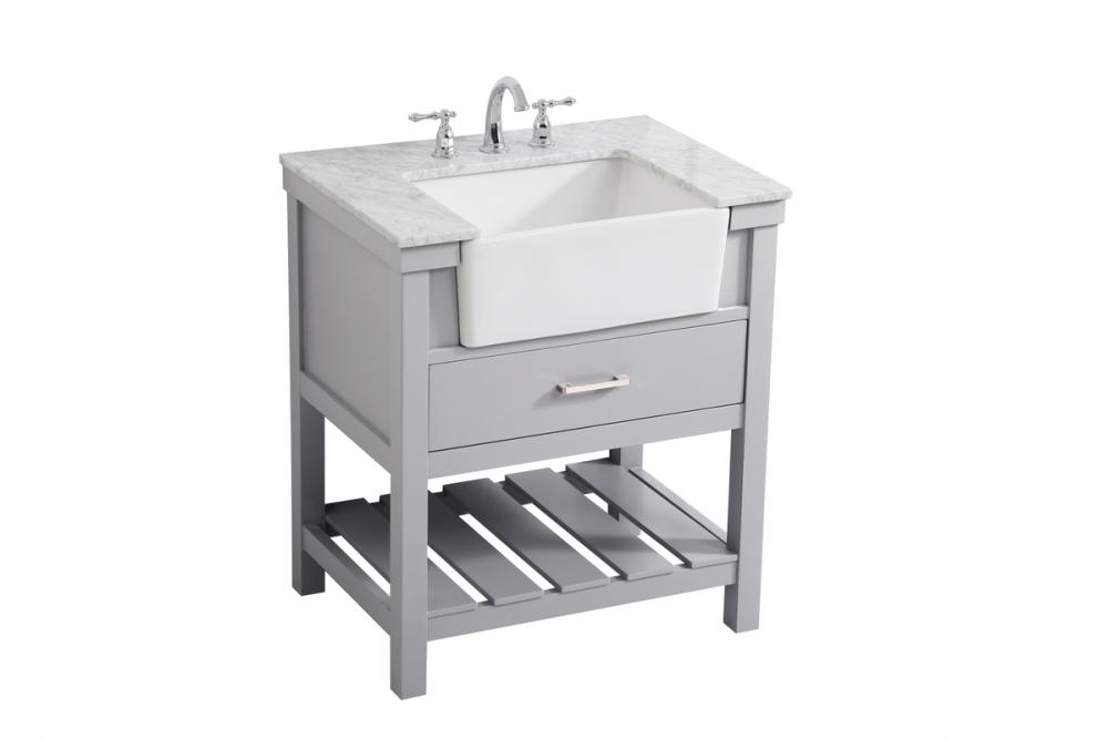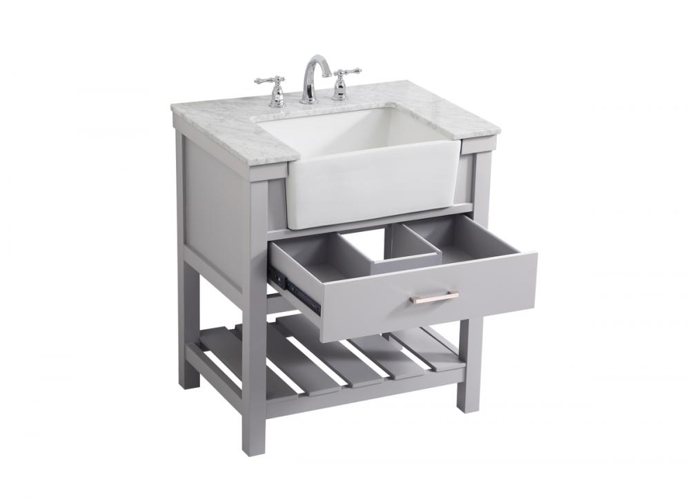 Make the most of your space with this farmhouse style bathroom vanity. Complements well with its beautiful finish, carrara white marble countertop, and the contemporary slender handle bar that sits on the functional drawers with soft closing mechanism, allowing you to store an assortment of bathroom essentials. The lower shelf makes it the perfect space to hold new towels for your guests. This stylish vanity ensures both form and function in your bathroom for you and your guests.