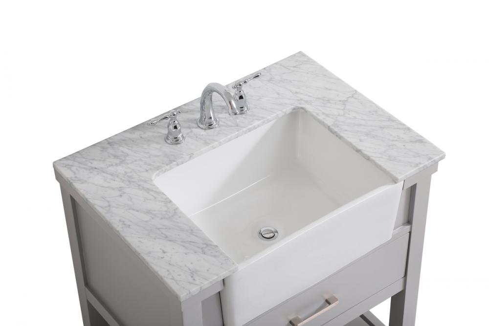 Comes with an apron porcelain sink and durable marble stone top in carrara white finish