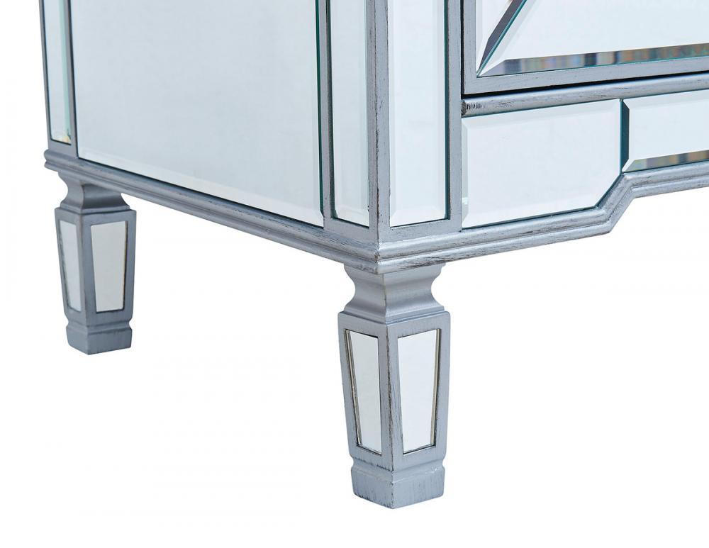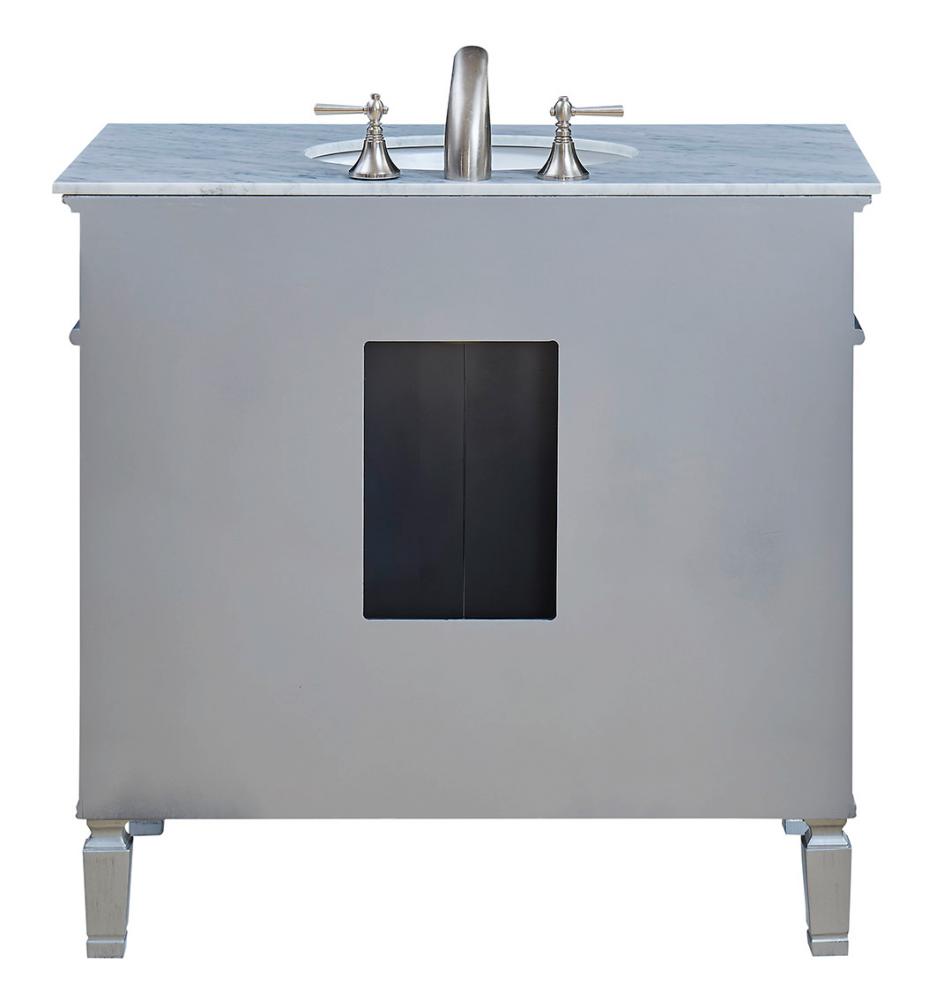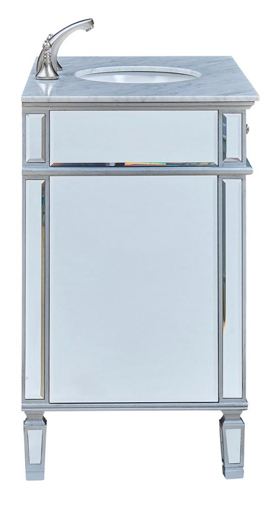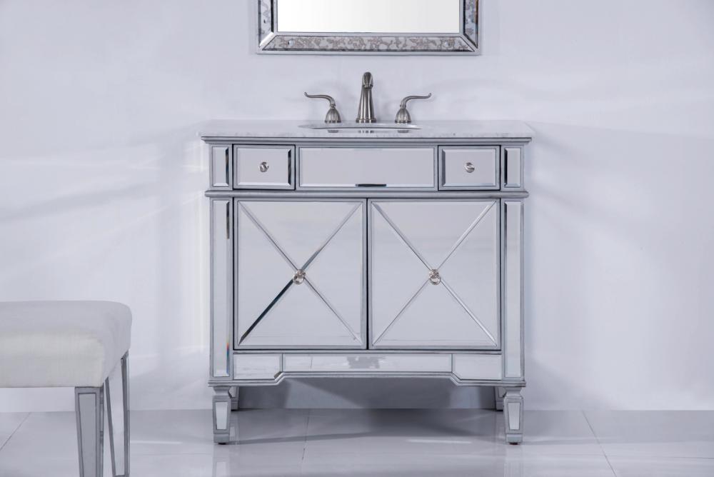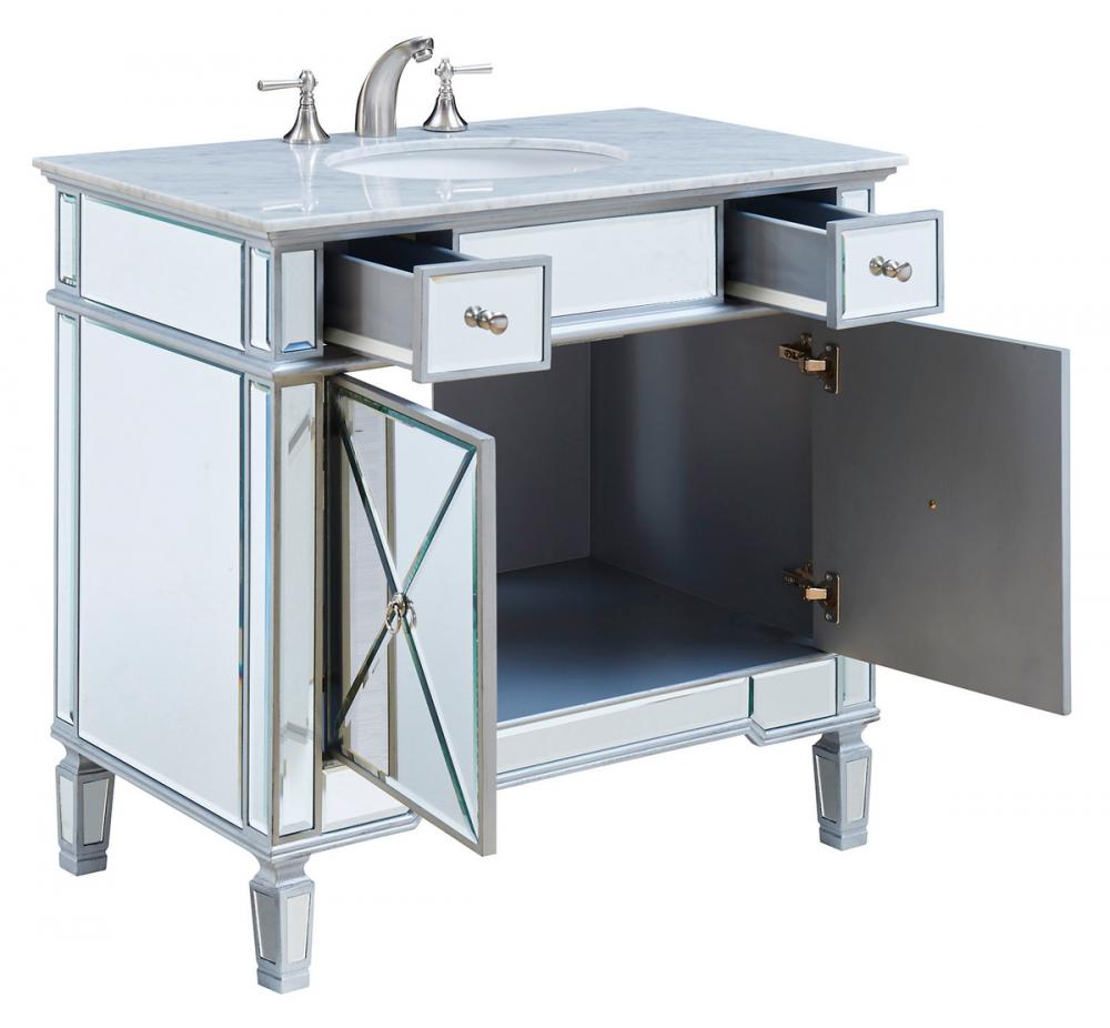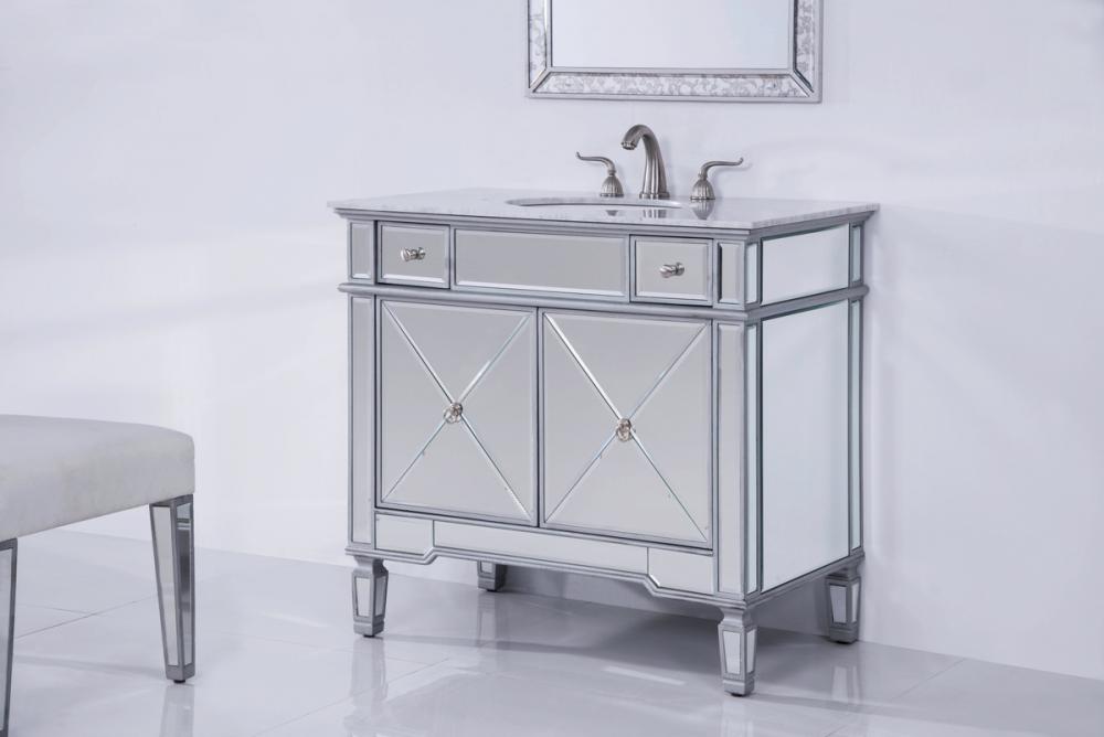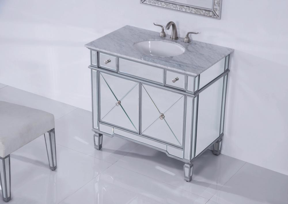 Beautiful vanity with an authentic carerra white marble top. The door is decorated in crisscrossed mirror panels in a hand-rubbed in silver finish. Decorated with brushed steel knobs and ring pull, this vanity will add a clean, sharp contemporary look and destine to please. Vanity ships ready to install.