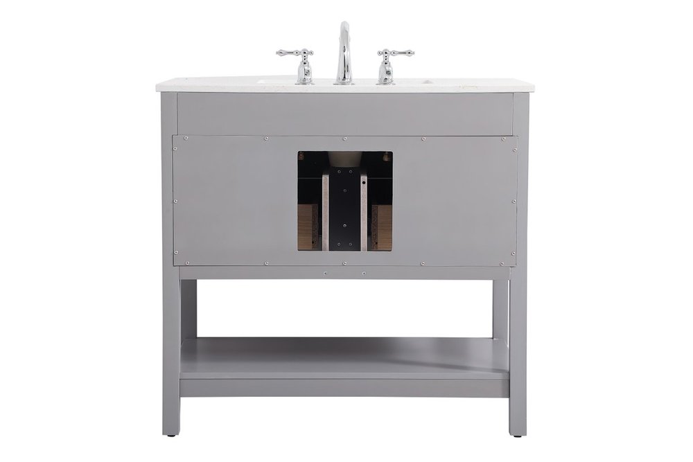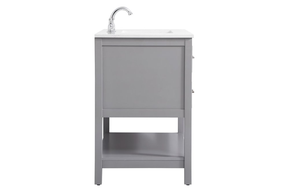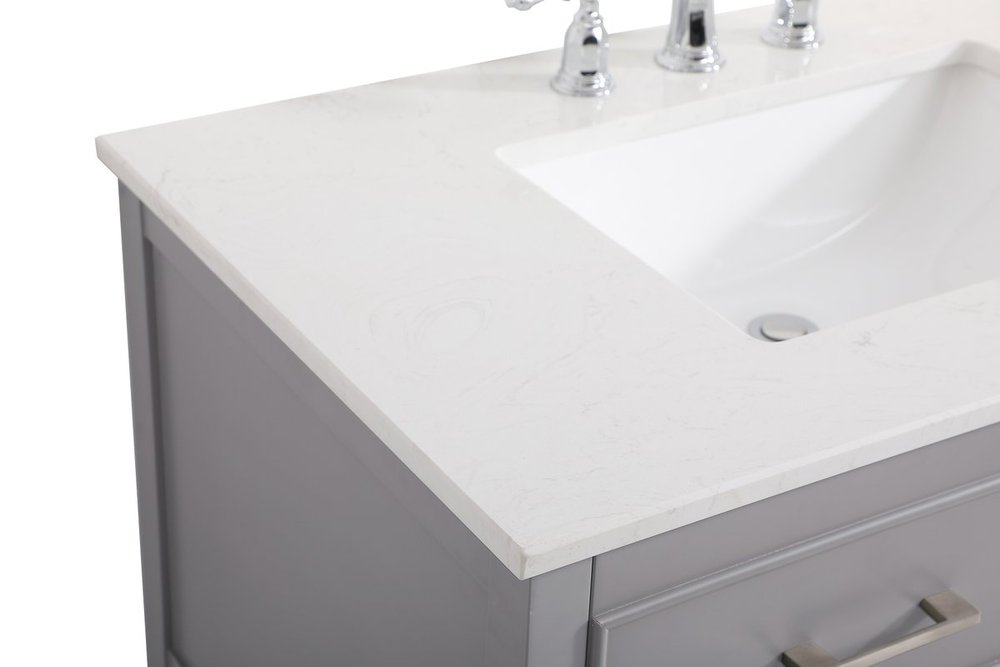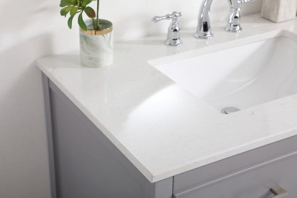 Make the most of your space with this traditional style bathroom vanity. Complements well with many aesthetics with its beautiful finish, calacatta engineered marble countertop, and the contemporary slender handle bar that sits on two upper false drawer and two lower u-shaped drawer, allowing you to store an assortment of bathroom essentials. The lower shelf makes it the perfect space to hold new towels for your guests. This compact vanity ensures both form and function in your bathroom or powder room for you and your guests.