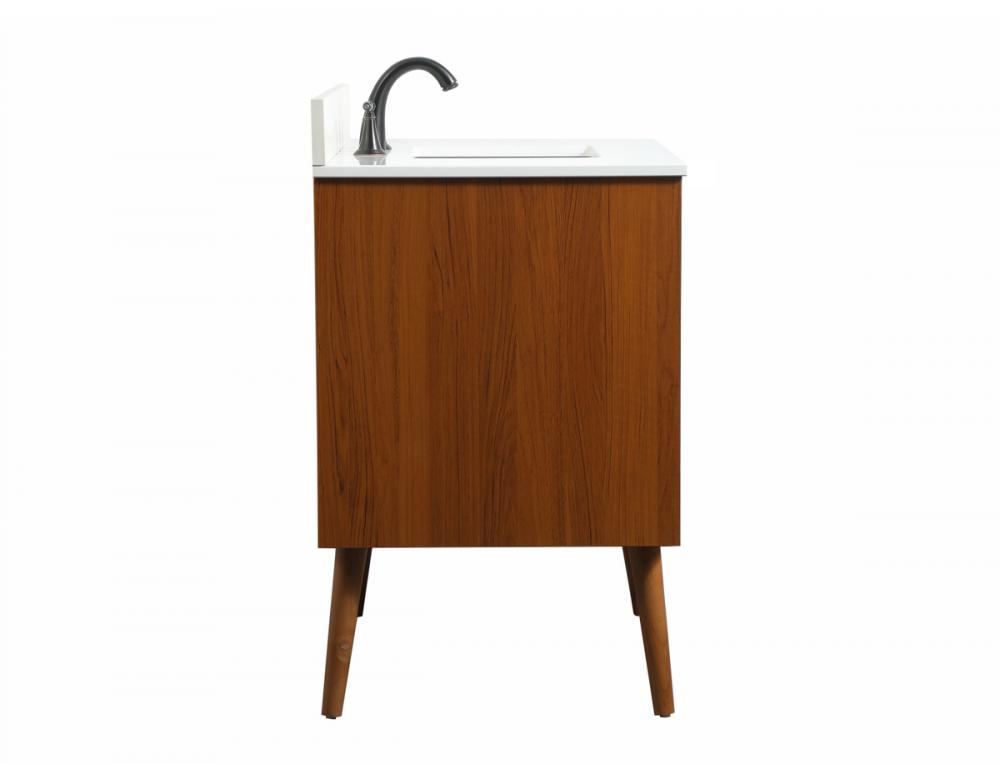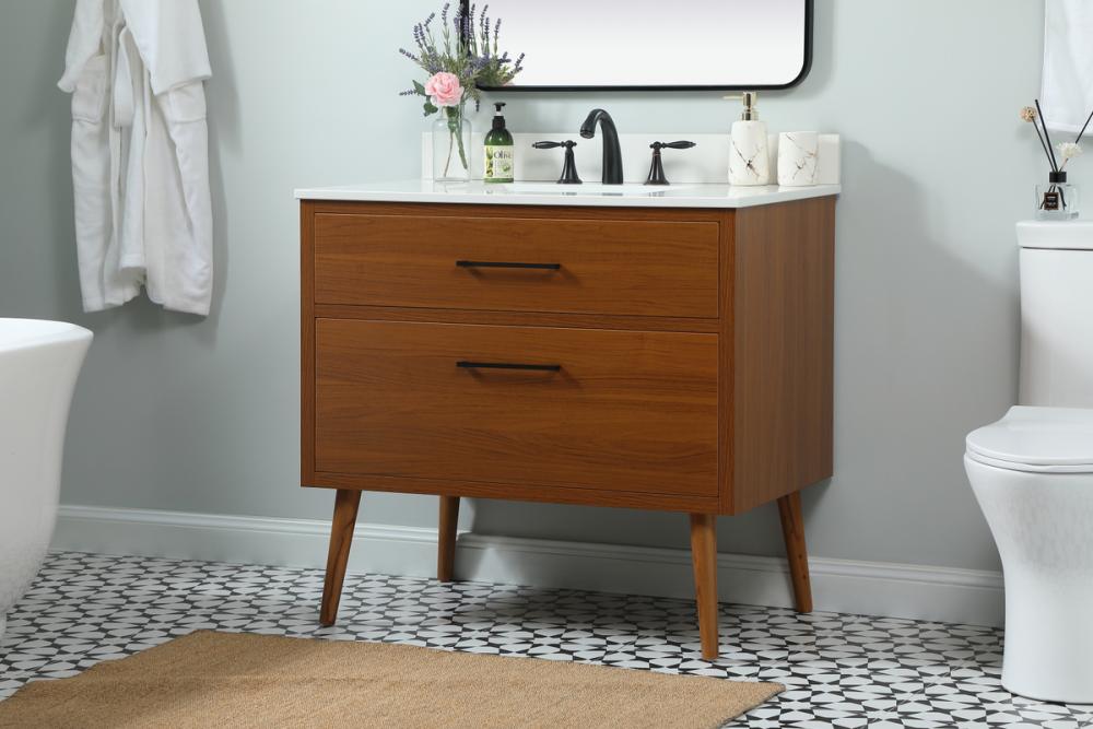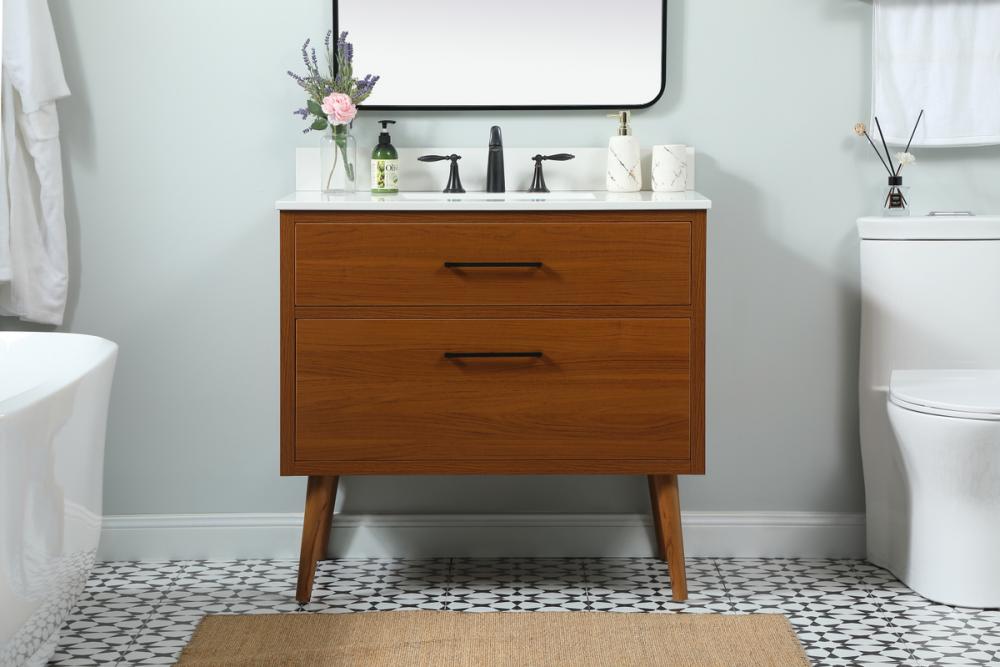This bathroom vanity is a perfect way to outfit your home in authetic midcentury modern style. The clean lines anchors the design, while the oblique tapered cylinder legs add subtle interest. A black handle adorns the top drawer hiding the base of the undermount porcelain sink while another one allows you to pull the bottom drawer out, letting you store your bathroom necessities and toiletries. The storage drawers provide much needed function and can be used for stowing items like extra toothbrushes, hairbrushes, and other bathroom essentials to help you get ready to face the day. This vanity is a quick update for your bathroom with trendy style. Comes with a matching backsplash to complete the look and protects your wall.
