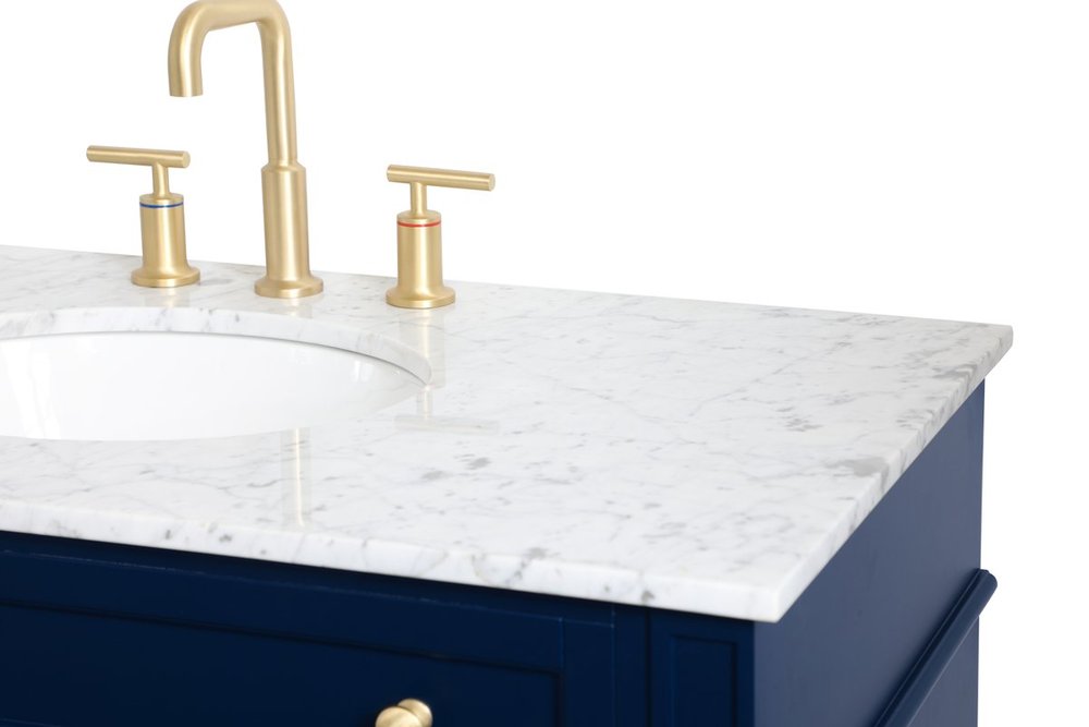 Modern sophistication is defined within the urbane blue finish and brushed gold knobs of this vanity. Its charming style it the perfect addition to any home, and saves space with its storage area hidden behind the double cabinet doors and 3 side drawers. Topped with a Carrara white marble counter top and a porcelain sink, this design will add everlasting class to your bathroom and powder room.