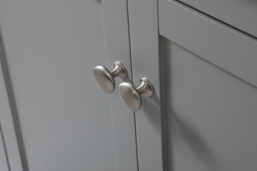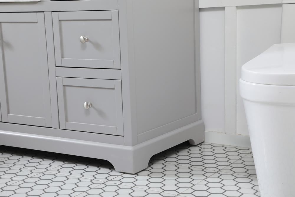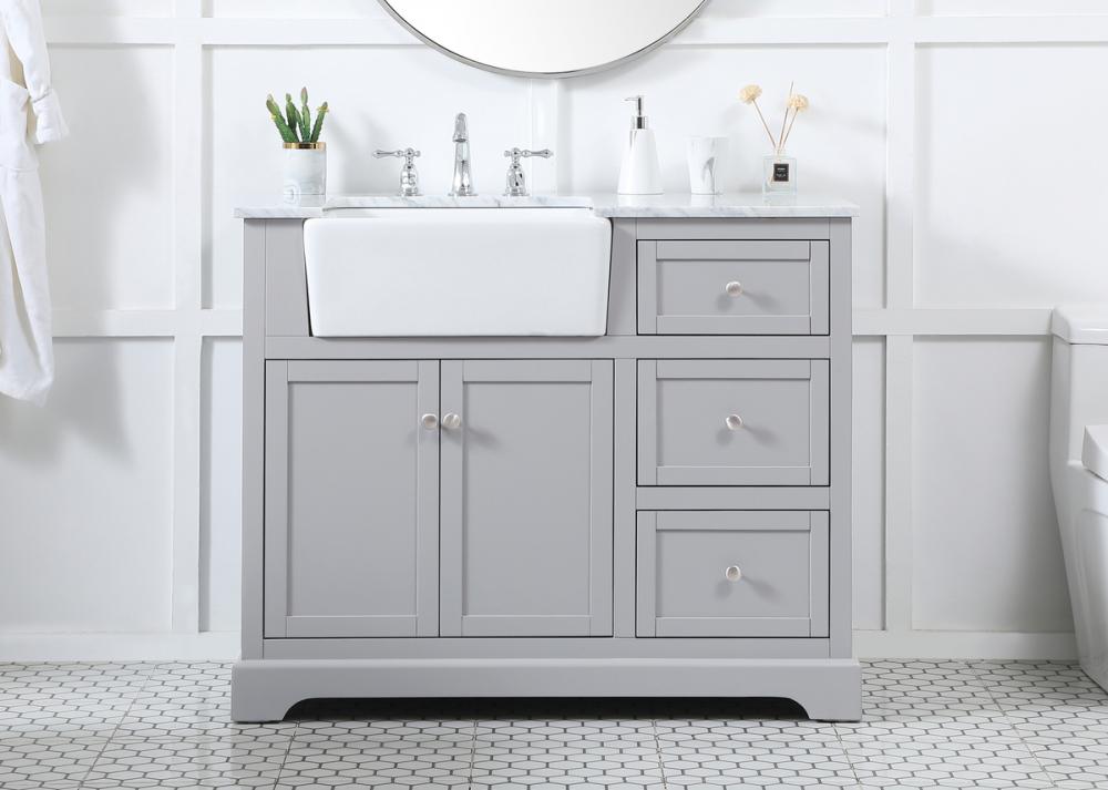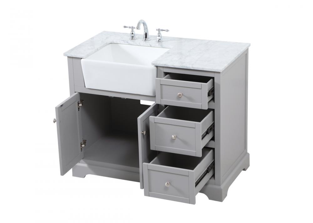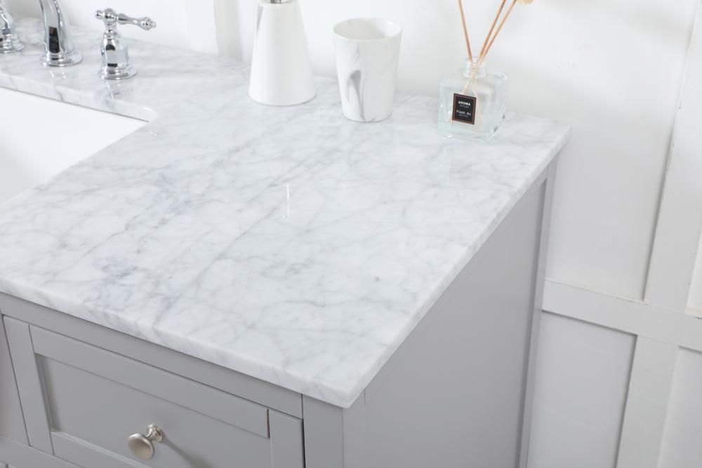 Make the most of your space with this farmhouse style bathroom vanity. Complements well with its beautiful finish, carrara white marble countertop, and the contemporary slender handle bar that sits on the functional drawers with soft closing mechanism, allowing you to store an assortment of bathroom essentials. The lower shelf makes it the perfect space to hold new towels for your guests. This stylish vanity ensures both form and function in your bathroom for you and your guests.