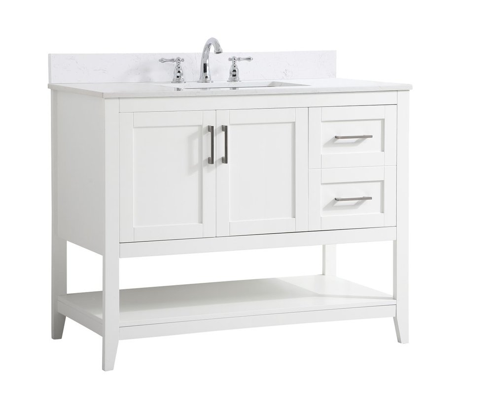 The nonchalant attitude of this 42" traditional white finish vanity will have you wanting more. The slender brushed nickel handle bars open the 3 cabinet doors to reveal ample storage space to put away and store bathroom essentials, and the open space below allows for you to place clean towels on the rack. Topped with a Calacatta engineered marble countertop, you and your guests will enjoy this easy going vanity. Comes with a matching backsplash to complete the look and protects your wall.