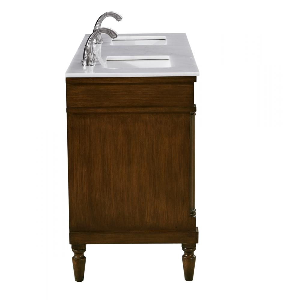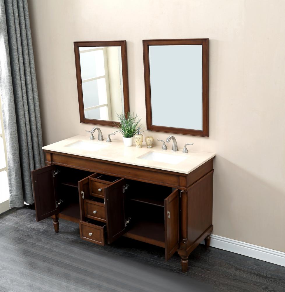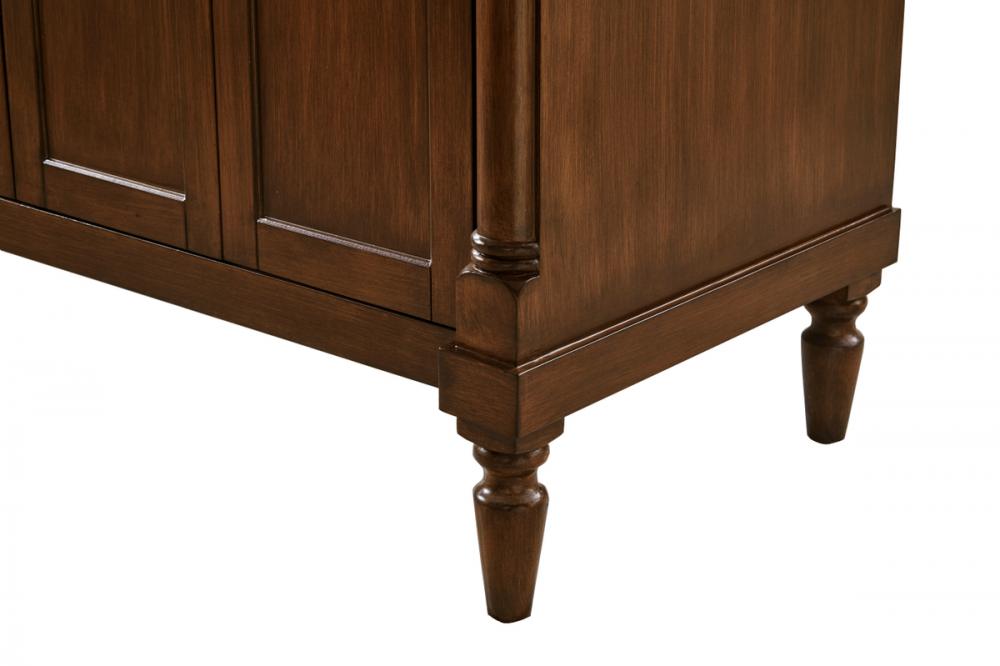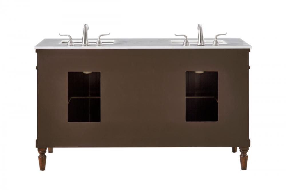 This traditionally styled, yet fashionably designed vanity can add distinction and grace to your home or office bathroom. Beautifully combining a lustrous natural white marble countertop with 2 large rectangular white porcelain under mount sink, and a hand painted walnut cabinet with 3 full extension drawers and 4 doors with shelf inside, brushed steel door pulls, standing on turned, tapering legs. You’ll enjoy its charming allure for many years to come. Measurements: W60” x D21” x H35”