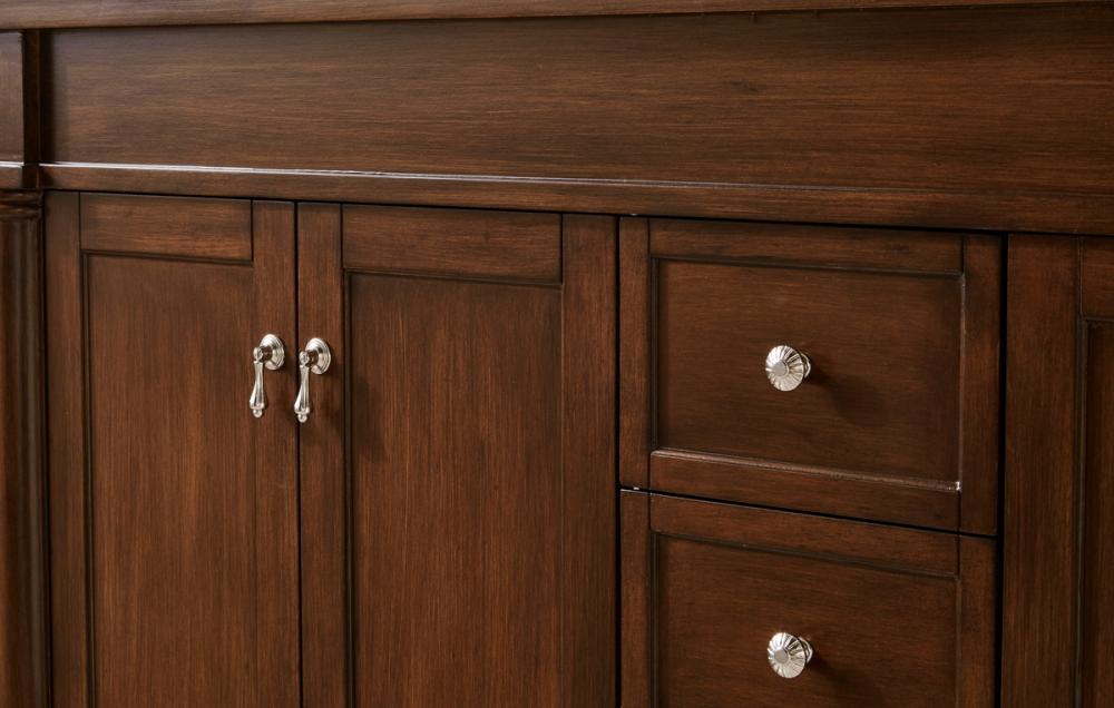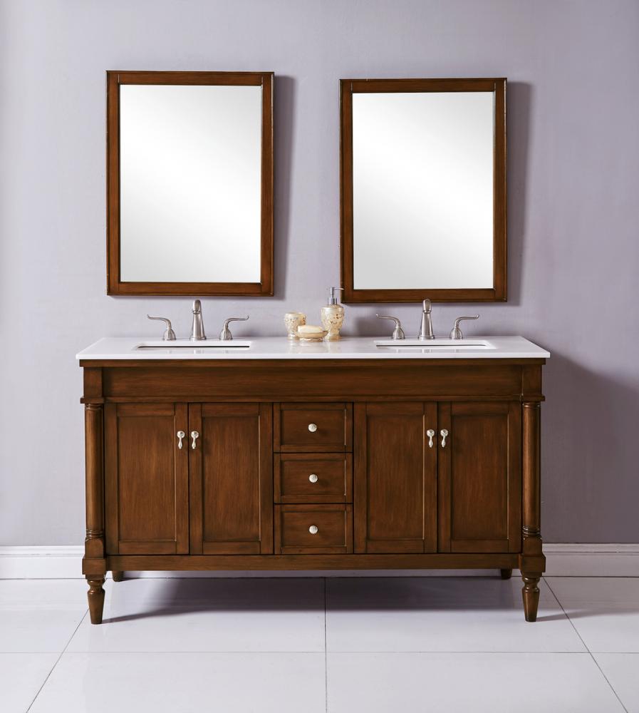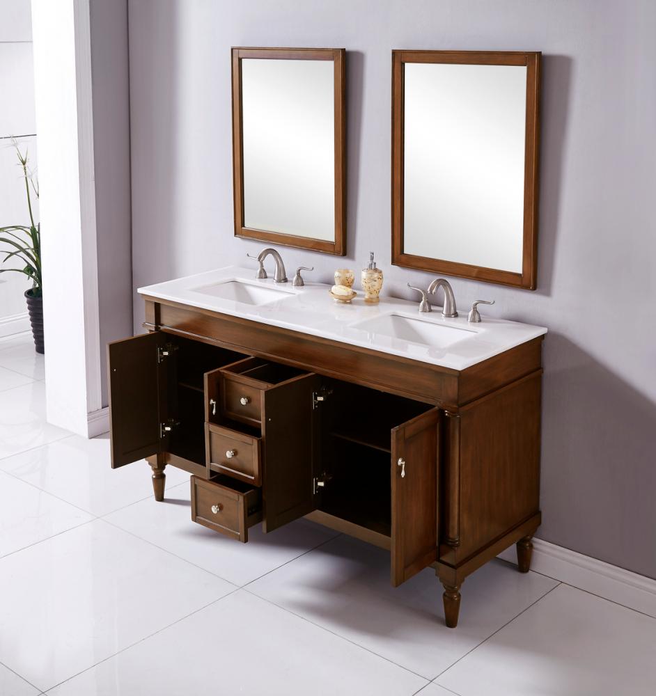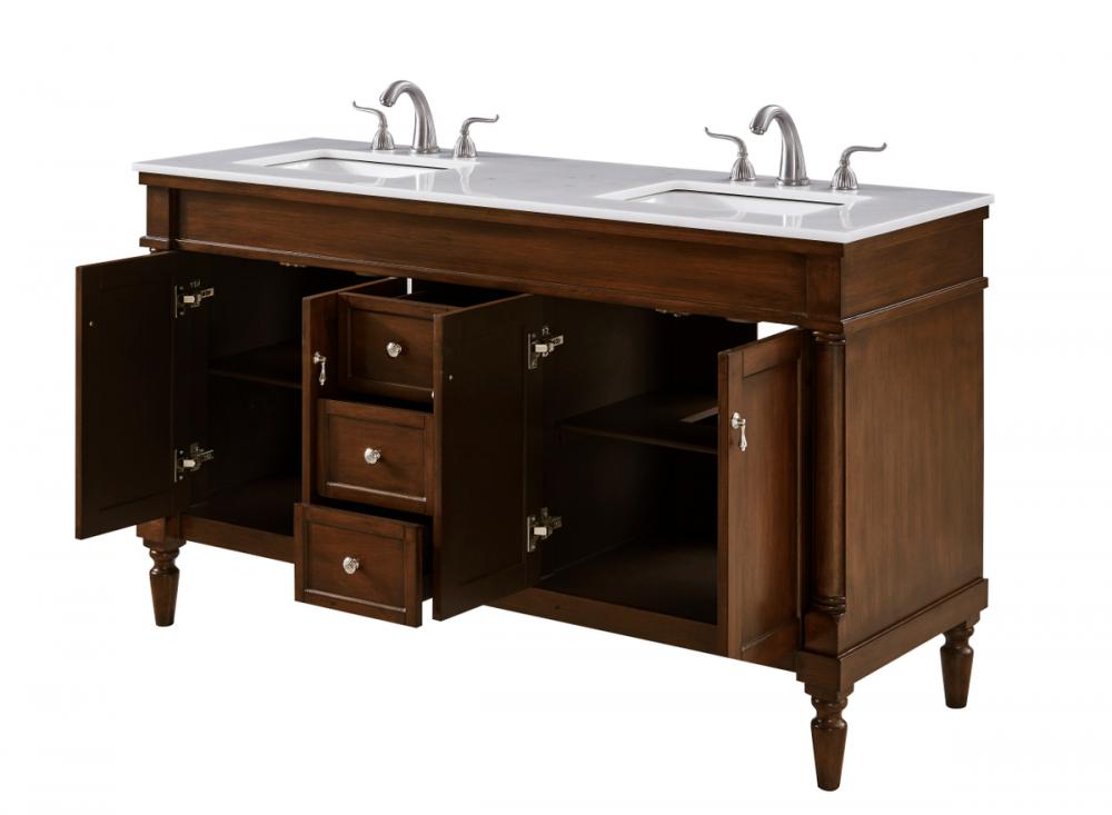 This traditionally styled, yet fashionably designed vanity can add distinction and grace to your home or office bathroom. Beautifully combining a lustrous natural white marble countertop with 2 large rectangular white porcelain under mount sink, and a hand painted walnut cabinet with 3 full extension drawers and 4 doors with shelf inside, brushed steel door pulls, standing on turned, tapering legs. You’ll enjoy its charming allure for many years to come. Measurements: W60” x D21” x H35”