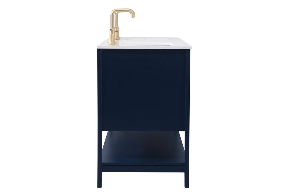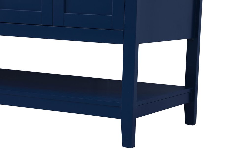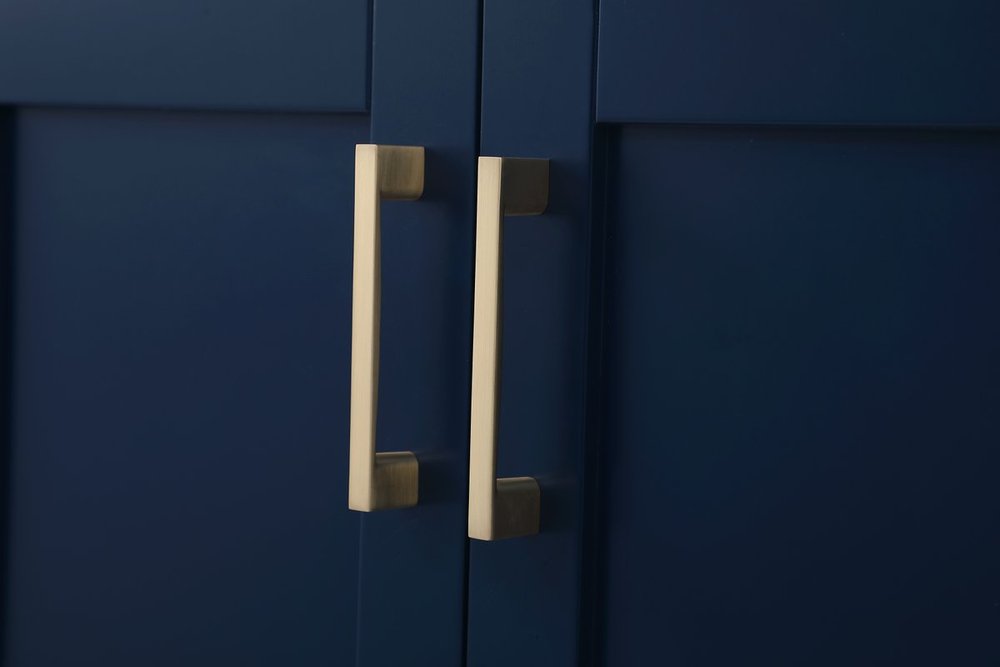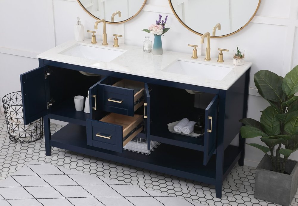 The nonchalant attitude of this 60" traditional Blue finish vanity will have you wanting more. The slender gold handle bars open the two double cabinet doors and two center drawers to reveal ample storage space to put away and store bathroom essentials, and the open space below allows for you to place clean towels on the rack. Topped with a Calacatta engineered marble countertop and double porcelain undermount sink, you and your guests will enjoy this easy going vanity.