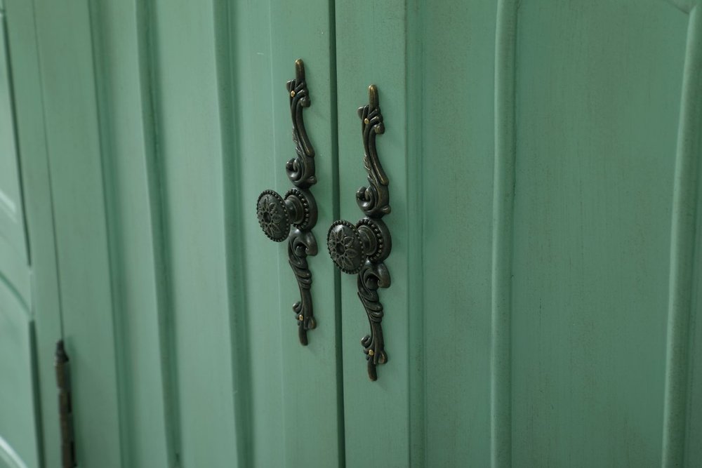 Hand painted in vintage mint finish with distress paint application