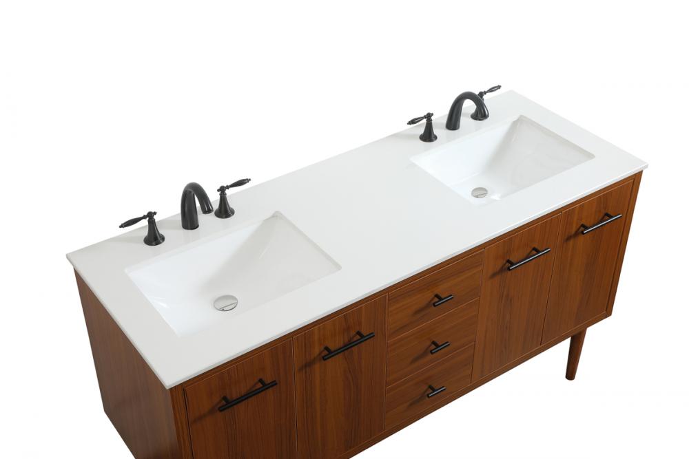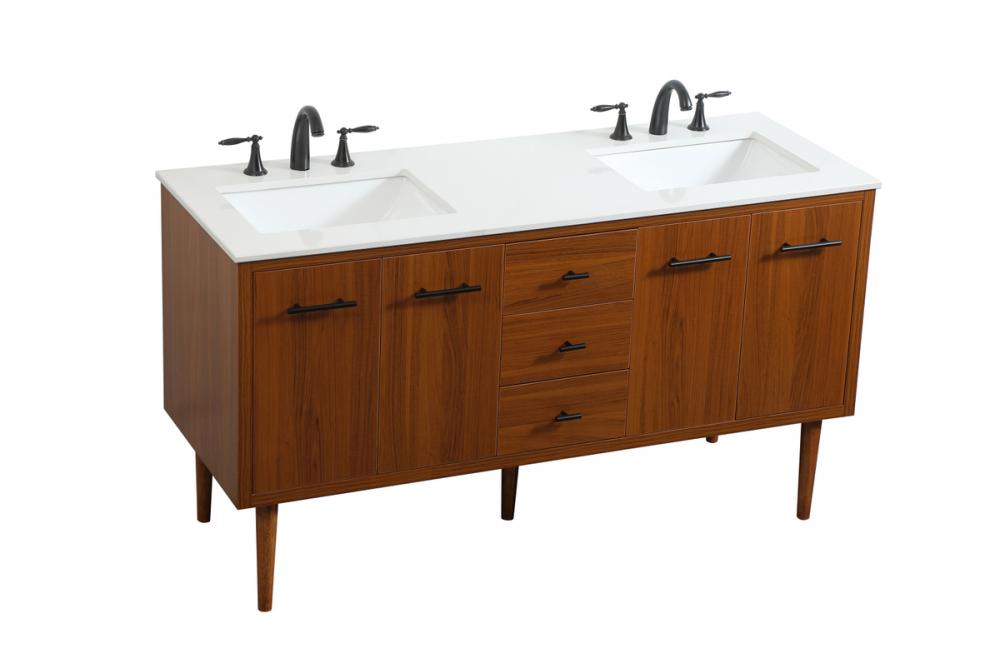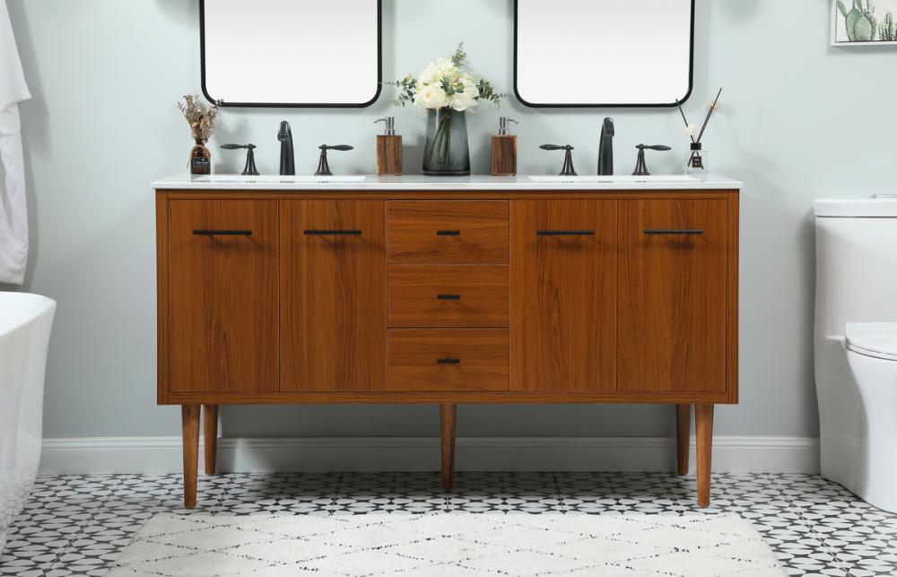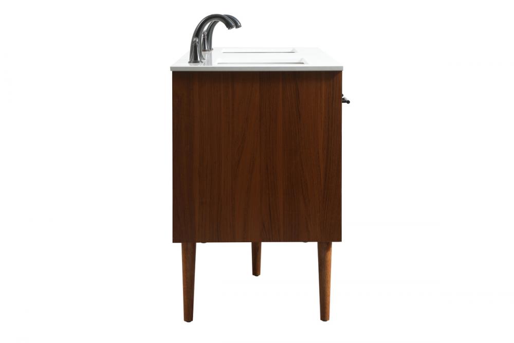 Delve into a world of minimalistic fashion and contemporary styling with this midcentury modern vanity. The clean lines anchors the design, while the straight tapered cylinder legs add subtle interest. Bar pull handle adorns the soft closing door hiding the base of the rectangular porcelain sink and letting you store your bathroom necessities and toiletries. Three soft closing drawers add plenty of storage option. Whether you want to use this as a floating vanity or a freestanding vanity, the choice is yours. The durable ivory white engineered marble countertop complements the manufactured wood base vanity and is built to last.