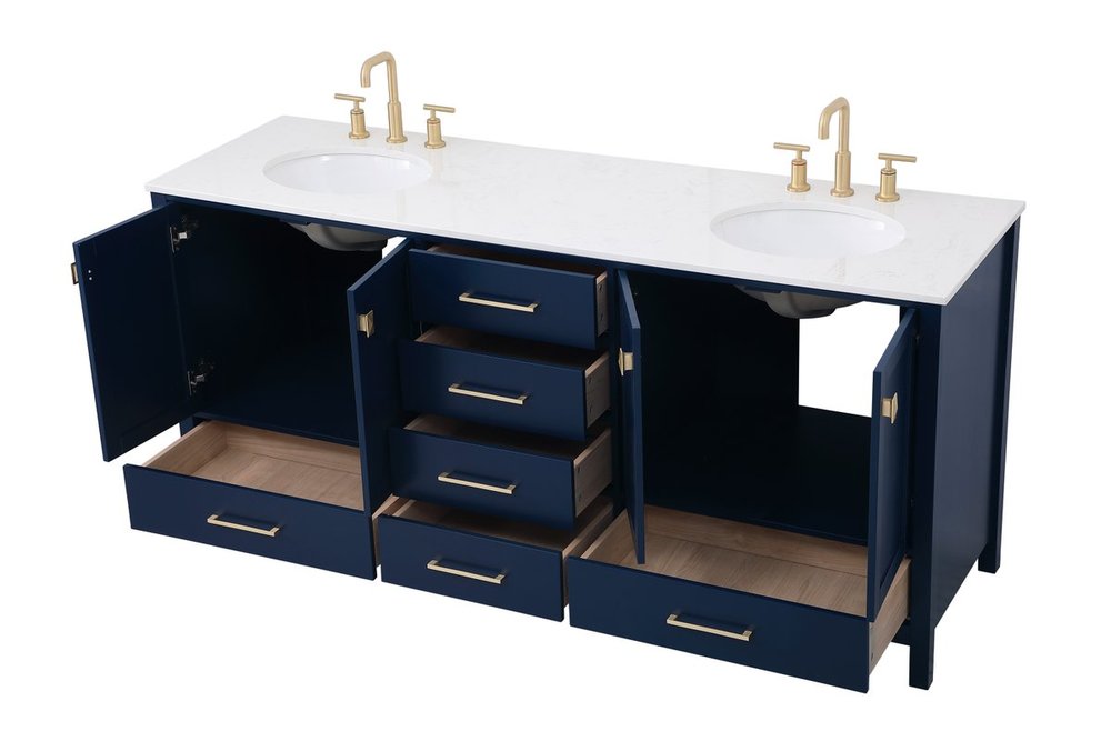 Never compromise beauty--the Irene collection stunning vanity in a blue finish will add lovely sophistication and complement any bathroom or powder room, while utilizing its charm and function to provide you with ample storage spaces. Satin gold pulls gently adorn the minimalist cabinet doors and drawers at the base, allowing for you to store away your bathroom essentials. The calacatta engineered marble countertop, porcelain undermount sink, dignified subtle engravings on the side edges, and squared legs all come together to create contemporary beauty. Work with your space, and design a beautiful room, no matter the size.