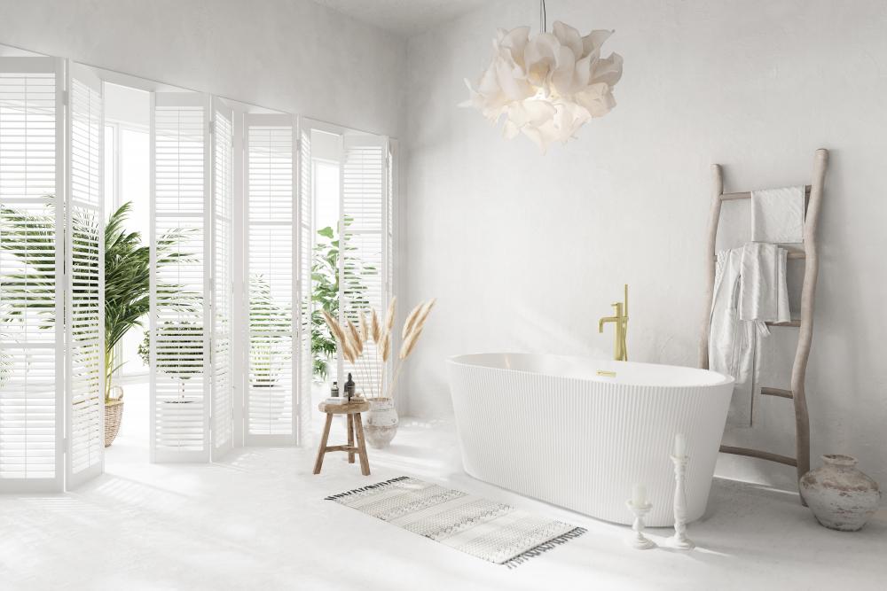 Elevate your bathroom’s aesthetic with this stunning freestanding soaking bathtub, featuring a vertical fluted exterior design that adds texture and sophistication to any space.