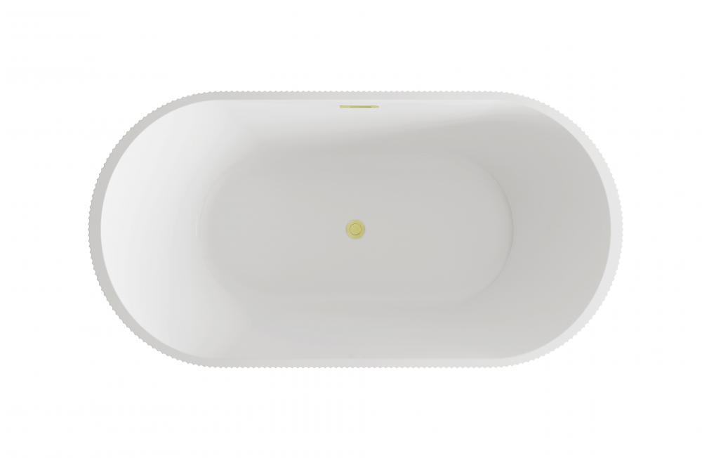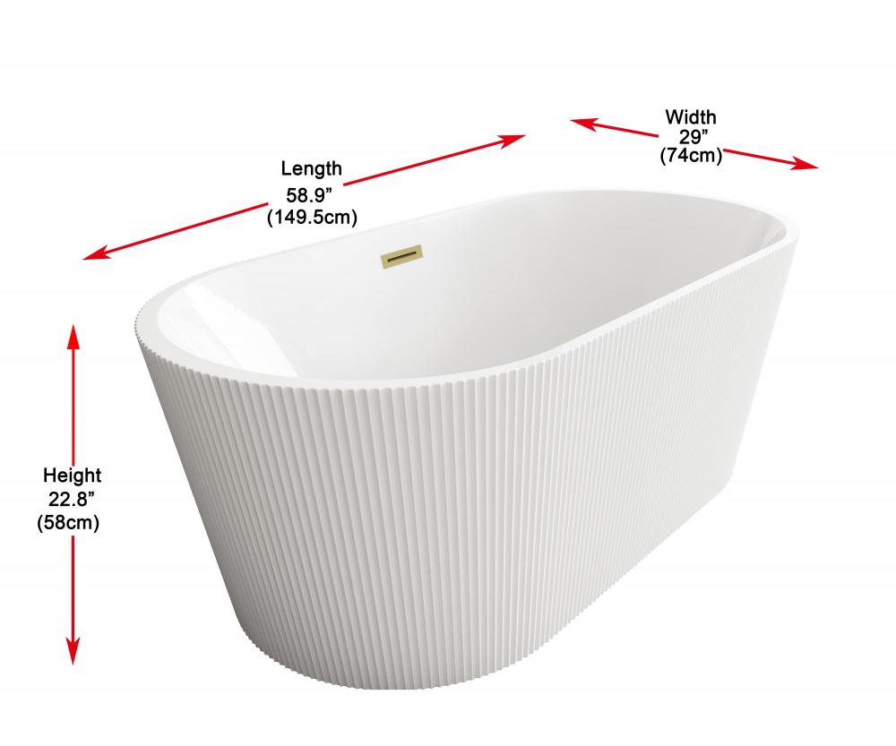 Immerse yourself in the ultimate relaxation experience with this elegant freestanding soaking bathtub, featuring a beautifully textured vertical fluted design that adds a touch of sophistication to your bathroom. The smooth, rounded rim offers comfortable arm support, making it the ideal spot to unwind. Equipped with a pop-up drain and integrated overflow, this tub seamlessly combines convenience and style. with a generous capacity and 15-inch soaking depth, it's perfect for those looking to indulge in a deep, luxurious soak. Available with customizable drain trim finishes like brushed gold, matte black, and more, this bathtub is designed to fit your unique style. Durable and easy to install with adjustable foot levelers, this tub is both a statement piece and a functional retreat in your home.