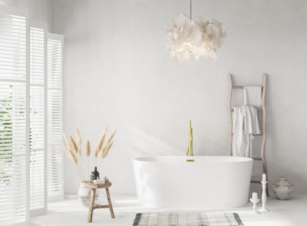 A double-ended freestanding bathtub offers symmetry and luxury. Both ends are gently sloped, allowing for comfortable reclining from either side.