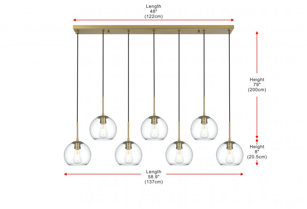 The Baxter hanging pendant light combines refined style with a practical design, adding cosmopolitan sophistication to any space—be it an entryway, hallway, bathroom, kitchen, or closet. The sleek iron frame, complete with a rectangular canopy, elegantly supports seven clear spherical glass shade that stays open at the center, making bulb replacement effortless. Designed for those who love the look of big-city elegance, the Baxter pendant makes sophisticated living easy.