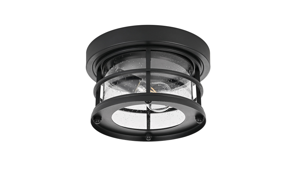 This outdoor flush mount light blends nautical and industrial influences, featuring a rounded frame with horizontal guard rails and a clear seedy glass cylinder for a structured yet functional look. The black-finished iron frame ensures durability, while the textured seedy glass enhances light diffusion, creating a warm, inviting glow. The open-bottom design allows for quick bulb changes, and the flush mount installation makes it a great choice for low-ceiling outdoor spaces such as covered porches, patios, and entryways. Designed for an E26 base bulb (not included), this fixture is also dimmable, offering adjustable brightness levels. ETL Damp Rated, this light is built to withstand moisture and outdoor conditions, making it a reliable and well-structured addition to any exterior setting. Built with marine-grade, corrosion-resistant aluminum, this sconce withstands coastal conditions for long-lasting durability.