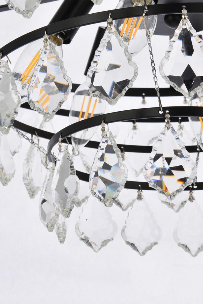 Tiers of clear multi-faceted crystals reflect the soft glow of candelabra bulbs