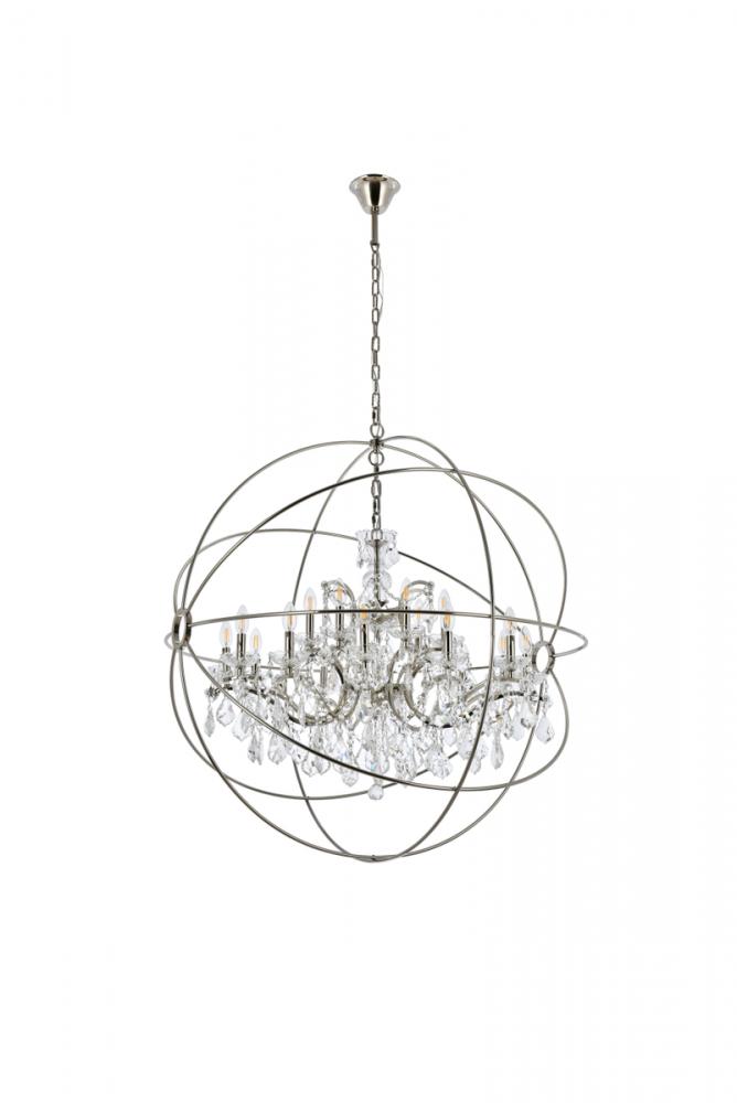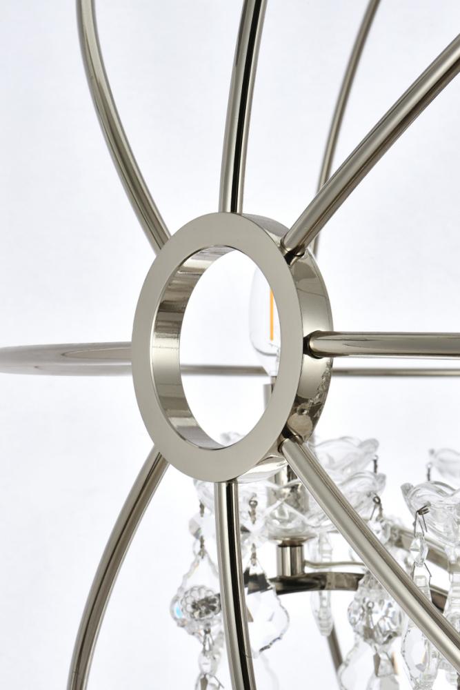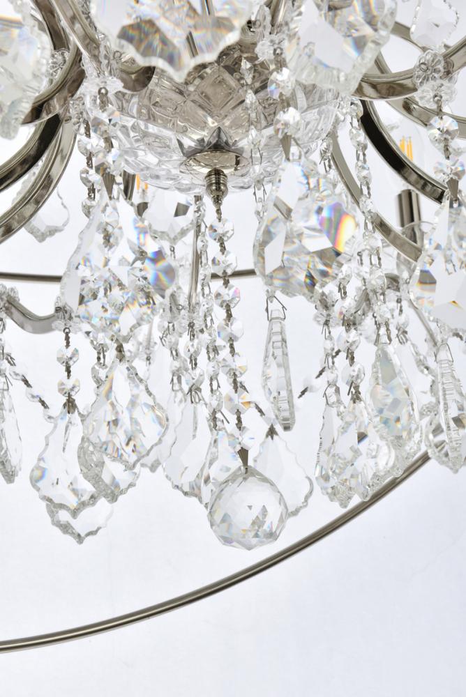 Royal-cut clear crystals and 18 candelabras beautifully complement the polished-nickel finish