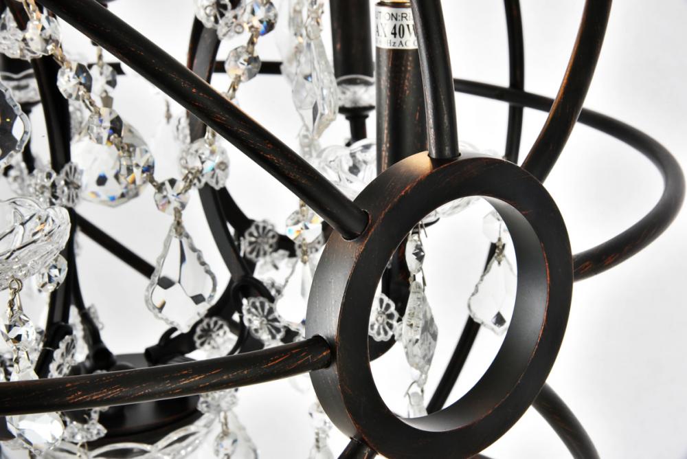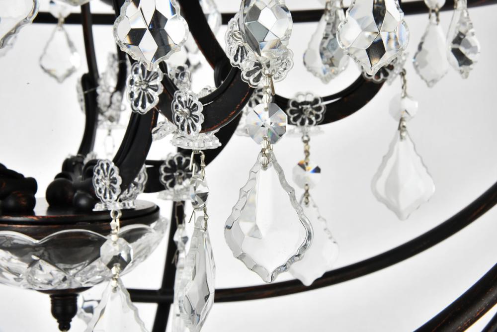 Royal-cut clear crystals and five candelabras create a dramatic contrast with the dark-bronze finish
