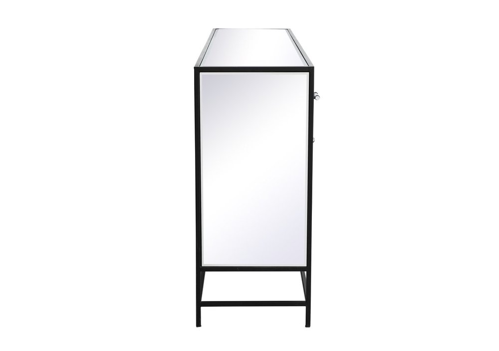 Crafted with mdf, clear mirror panels, and acrylic knobs with metal accents