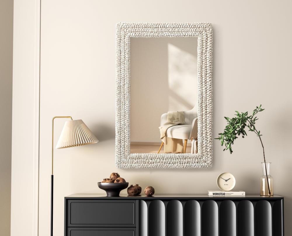 Transform your space with this stunning wall mirror that blends natural charm with functional design. Crafted from MDF, cornhusk, and high-quality mirror, the textured woven frame brings warmth and character to your decor. Whether you're decorating a hallway, living room, or bedroom, this mirror comes in a variety of shapes—including rectangle, round, oval, and arch—along with multiple size options to perfectly suit your needs. Designed for versatility, the mirror features four inset metal hangers, allowing you to mount it either vertically or horizontally with ease. Its reflective surface not only adds a touch of brightness but also creates the illusion of a larger room, enhancing your space. with durable materials and ready-to-hang hardware, this mirror is as practical as it is stylish, making it a must-have piece for any home.
