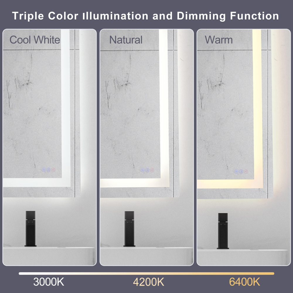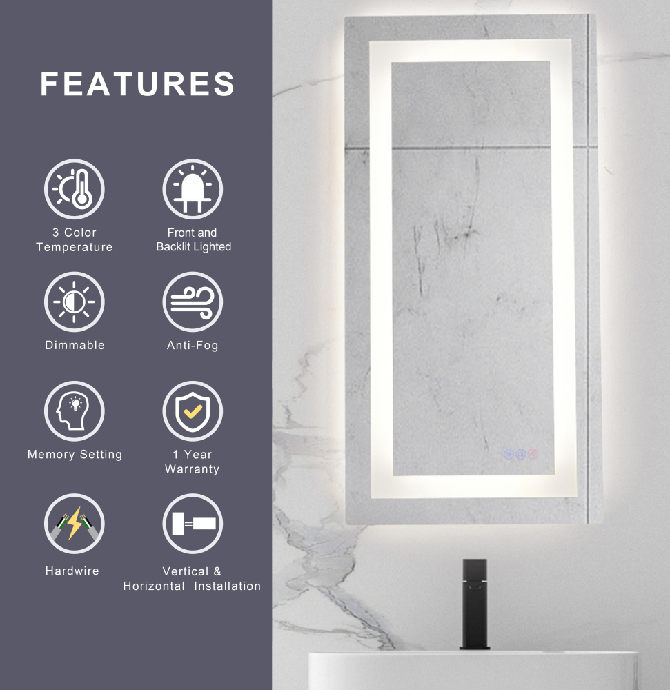 Redefine your daily routine with this ultra-modern LED mirror, designed to offer the perfect blend of style and functionality. Featuring both front and back illumination, this mirror provides a soft yet powerful glow that enhances your space with a luxurious ambiance. The adjustable color temperature (ranging from 3000K to 6400K) allows you to customize the warmth or coolness of your lighting, while the dimmable function lets you create the perfect brightness level. With a 90 CRI rating, this mirror ensures accurate color representation, making it perfect for grooming, makeup application, or daily self-care. The built-in defogger keeps your reflection clear and can be turned on or off at your convenience. Thanks to the touch sensor controls, adjusting your mirror's settings is effortless, and the memory function saves your last preferred settings for a seamless experience. Designed for versatile installation, this mirror can be hung vertically or horizontally using the included French cleats, making it a stunning and adaptable addition to any bathroom or vanity. It can be hardwired or connected to a wall switch for your convenience. Elevate your space with a mirror that not only reflects your image but also enhances your everyday routine with smart, modern lighting.