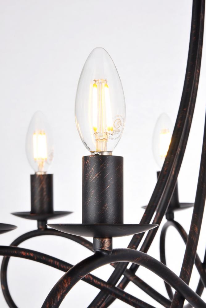 Lamp features a diameter of 28 inches, a height of 23 inches, a minimum hanging length of 29 inches, a maximum hanging length of 83 inches, and requires 8 candelabra bulbs