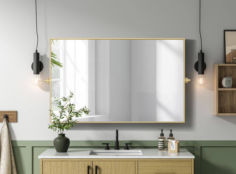 Upgrade your space with a modern pivot mirror that offers both form and function. Featuring an adjustable 8-degree tilt, this mirror allows you to customize your viewing angle for convenience and style. The iron frame with MDF backing ensures durability, while the hand-painted finish—available in black, silver, and brass—adds a touch of sophistication. Designed for versatility, this rectangular mirror can be mounted vertically or horizontally, making it the perfect fit for bathrooms, bedrooms, offices, and more. Its slim metal frame provides a sleek, contemporary aesthetic that blends seamlessly into various design styles. With included mounting brackets and screws, installation is simple and secure, giving your space an instant refresh. Whether you’re getting ready for the day or enhancing your home décor, this pivot mirror delivers both style and practi