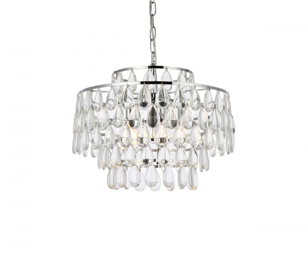 Tiers of clear smooth almond shaped crystals reflect the soft glow of candelabra bulbs