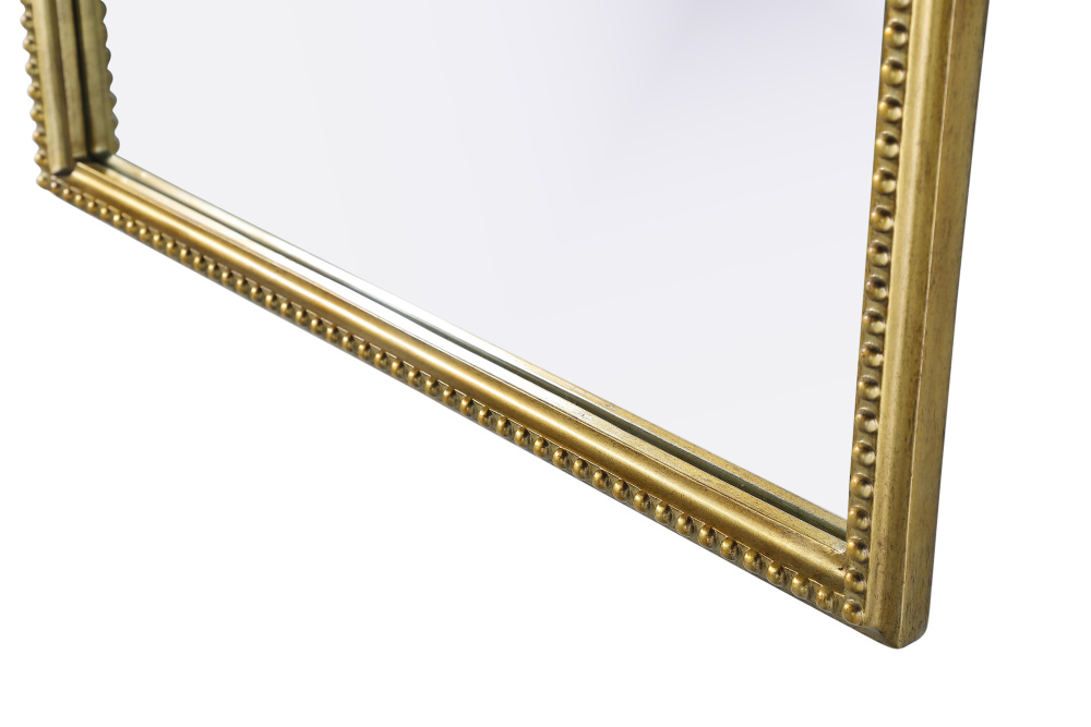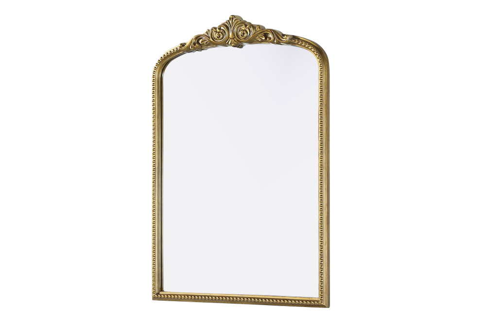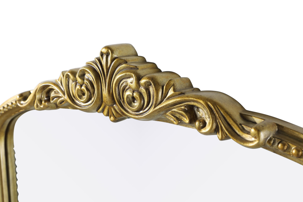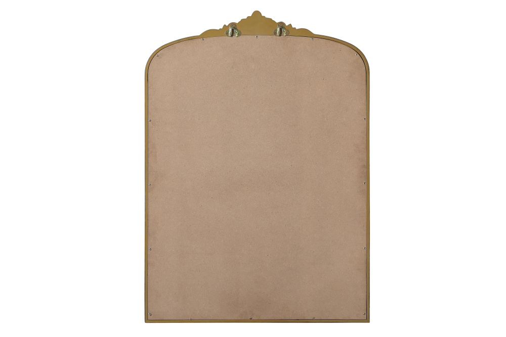 Add a touch of old-world charm to your home with this antique brass arched wall mirror, designed to bring timeless elegance and vintage character to any space. The hand-painted distressed finish gives the frame an aged, classic appeal, while the ornate crest and intricate detailing add a traditional European touch. Crafted from resin with an MDF backing board, this mirror is both lightweight and durable. Designed for vertical hanging only, it features two metal inset hangers for easy wall mounting (hardware not included). Whether placed above a fireplace mantel, in an entryway, or as an accent piece in a living room, this mirror creates a refined focal point. Available in multiple sizes and an alternative vintage bronze finish, it complements a variety of interiors, from classic and French country to vintage-inspired spaces.