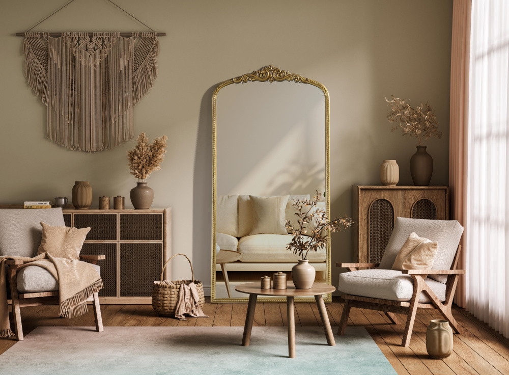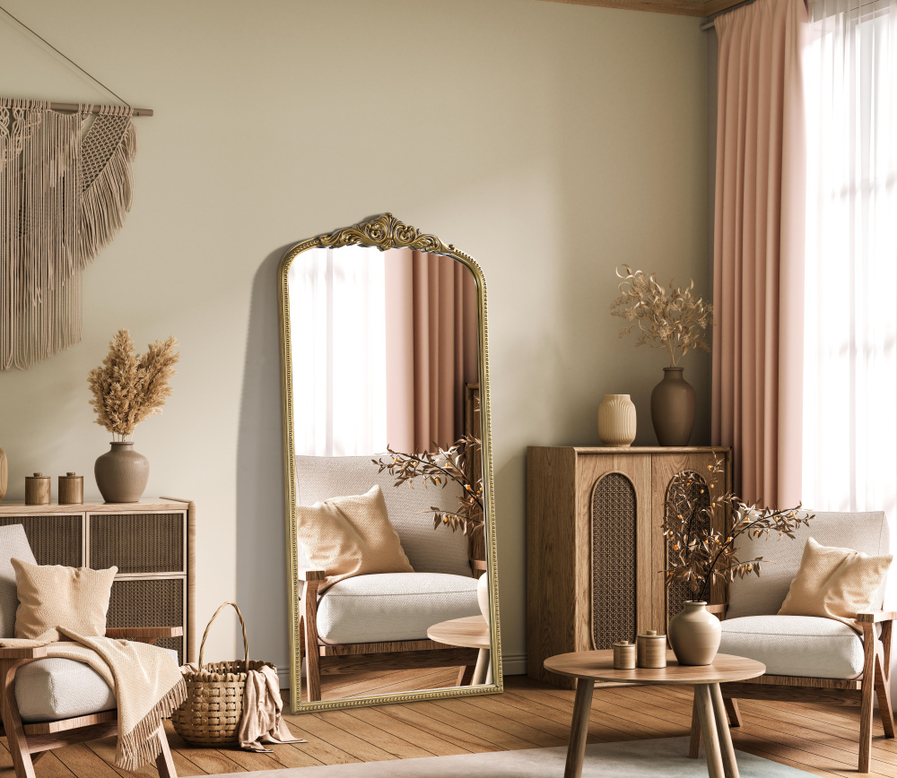 This full-length arched mirror brings a timeless, vintage-inspired charm to any space. The hand-painted antique brass finish and ornate crest detailing create a classic European look, perfect for traditional and French-inspired interiors. Whether leaned against the wall for a relaxed aesthetic or securely mounted using the metal inset hanger, this mirror offers versatility and refined style. Constructed from lightweight yet durable resin with an MDF backing board, it ensures long-lasting support and stability. Available in multiple sizes, this mirror is an ideal choice for bedrooms, entryways, and dressing areas, adding depth, light, and an elegant architectural presence to any room.