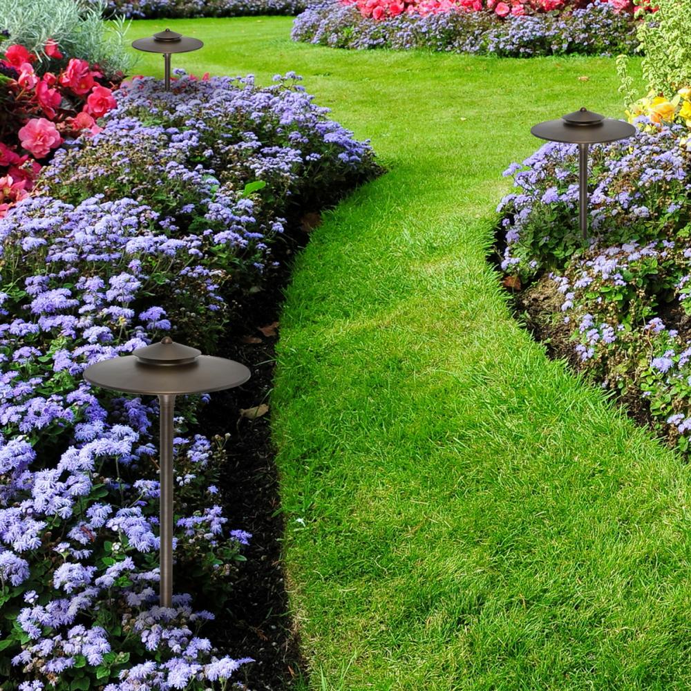 Inspired by the species of brightly-colored mushrooms, Chanterelle path lights create the perfect mood lighting for your evening stroll. The spinning brass frame in an antique-brass finish features an eight-inch spike for stability. with matching brass shade, the entire fixture stands 24 inches tall and requires a 35-watt G4 halogen bulb (not included). Ideal for brightening a dark driveway, front entrance, or a garden path.