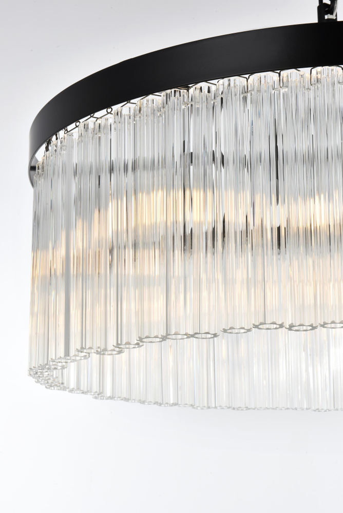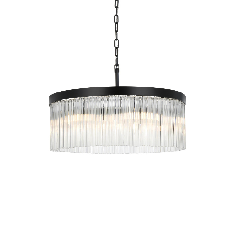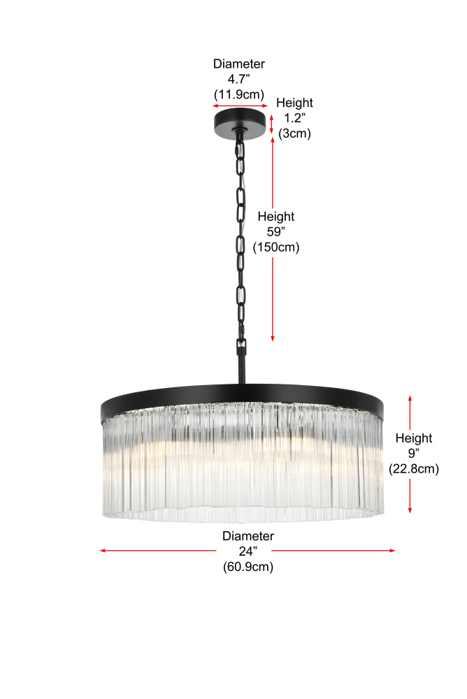 Turn your space into a glowing masterpiece with this striking pendant light, crafted from durable iron and shimmering clear ribbed glass. The cascading layers create a stunning interplay of light and shadow, refracting illumination into a radiant display that transforms your space into an illuminated work of art. Available in chrome for a sleek, contemporary aesthetic, black for bold contrast, and satin gold for an inviting warmth, this pendant light is as versatile as it is beautiful. Whether you choose a single tier for minimalist charm, two tiers for balanced depth, three tiers for bold presence, or four tiers for show-stopping grandeur, there’s an option for every setting. Featuring both round and rectangular frame designs, this fixture adapts to any space with ease. Complete with a matching canopy and chain, and fully dimmable for customized lighting, this pendant pairs perfectly with the coordinating single-tier flush mount and wall sconce collection, ensuring a cohesive, radiant design throughout youhome or office. Please note: light bulbs are sold separately.